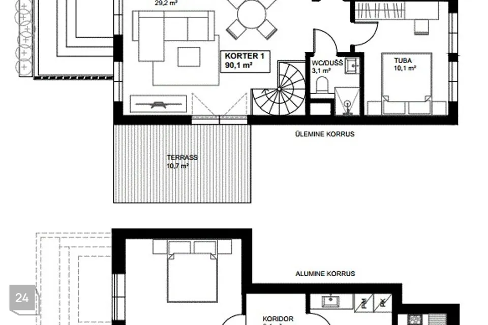 1. korrus: esik, avatud köök-elutuba, 2 magamistuba, WC ja duširuum, elutoast pääseb terrassile.