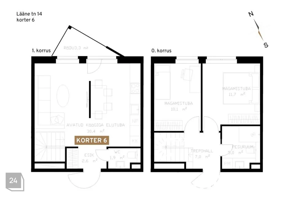 Müüdava korteri suletud netopindala on 68,70 m2, millele lisandub 3,3 m2 suurune rõdu. Korter paikneb läbi kahe korruse. 1. korrusel on esik, avatud köögiga elutuba ja wc ning 0. korrusel on kaks magamistuba ja duširuum-wc. Korteri hind sisaldab lõplikku siseviimistlust. Eluruumi põrandatele on parkett, seinad ja laed värvitud. San. ruumide seinad ja põrandad plaaditud ning paigaldatud sanitaartehnika (wc-pott, kraanikauss, dušisegisti).