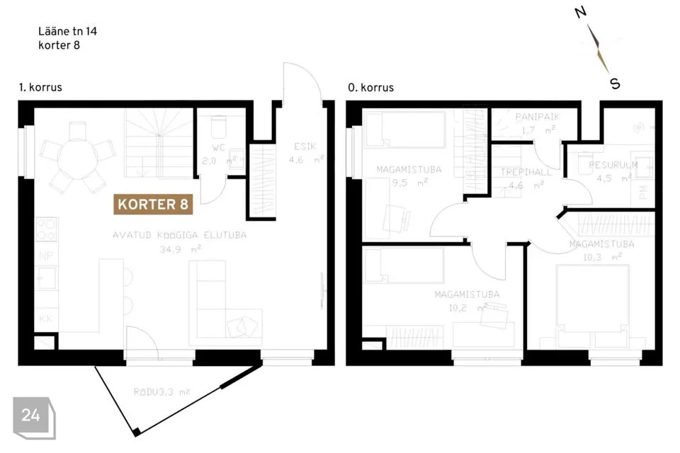 Müüdava korteri suletud netopindala on 82,30 m2, millele lisandub 3,3 m2 suurune rõdu. Korter paikneb läbi kahe korruse. 1. korrusel on esik, avatud köögiga elutuba ja wc ning 0. korrusel on kolm magamistuba, duširuum-wc ja panipaik. Korteri hind sisaldab lõplikku siseviimistlust. Eluruumi põrandatele on parkett, seinad ja laed värvitud. San. ruumide seinad ja põrandad plaaditud ning paigaldatud sanitaartehnika (wc-pott, kraanikauss, dušisegisti).