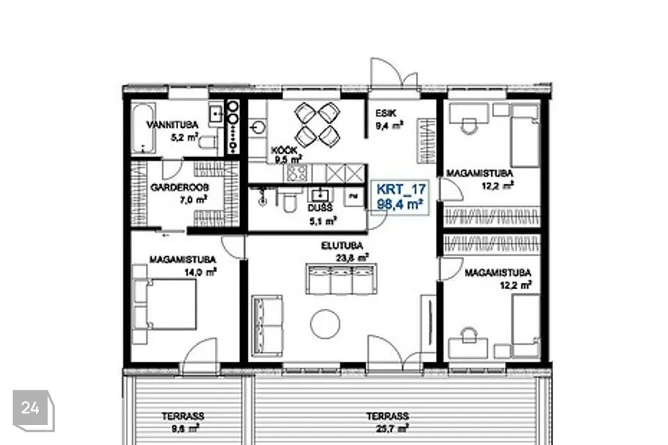 Antud korter on avar ja valgusküllane ning asub elamu I korrusel, korteri sisepind 98,3 m2 , lisaks kaks terrassi üldpinnaga 39,5m2 . Korteril on üks duširuum ja üks vannituba.