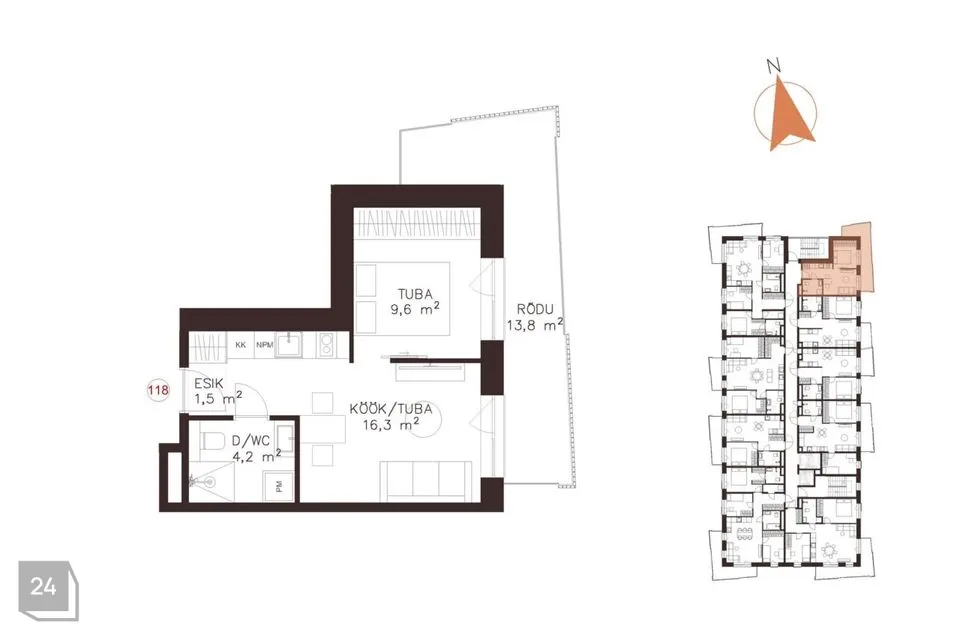 Kuulutuses mainitud korter nr 118 asub 9. korrusel ja koosneb magamistoast, san. ruumist, esikust ja avatud köögiga elutoast kokku suurusega 31,6 ruutmeetrit, millele lisandub rõdu 13,8 ruutmeetrit.