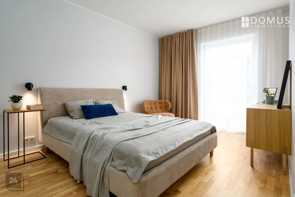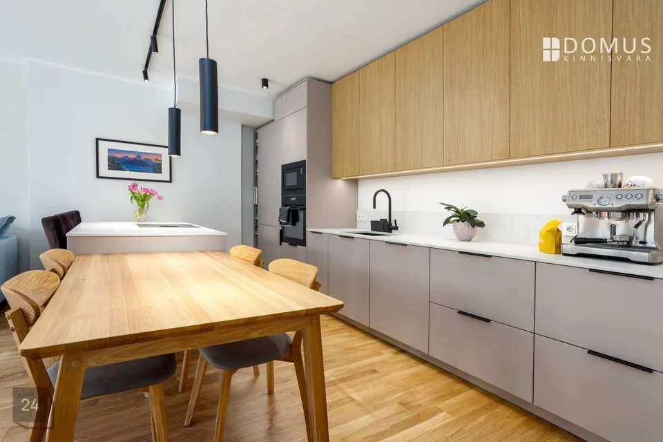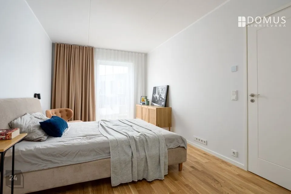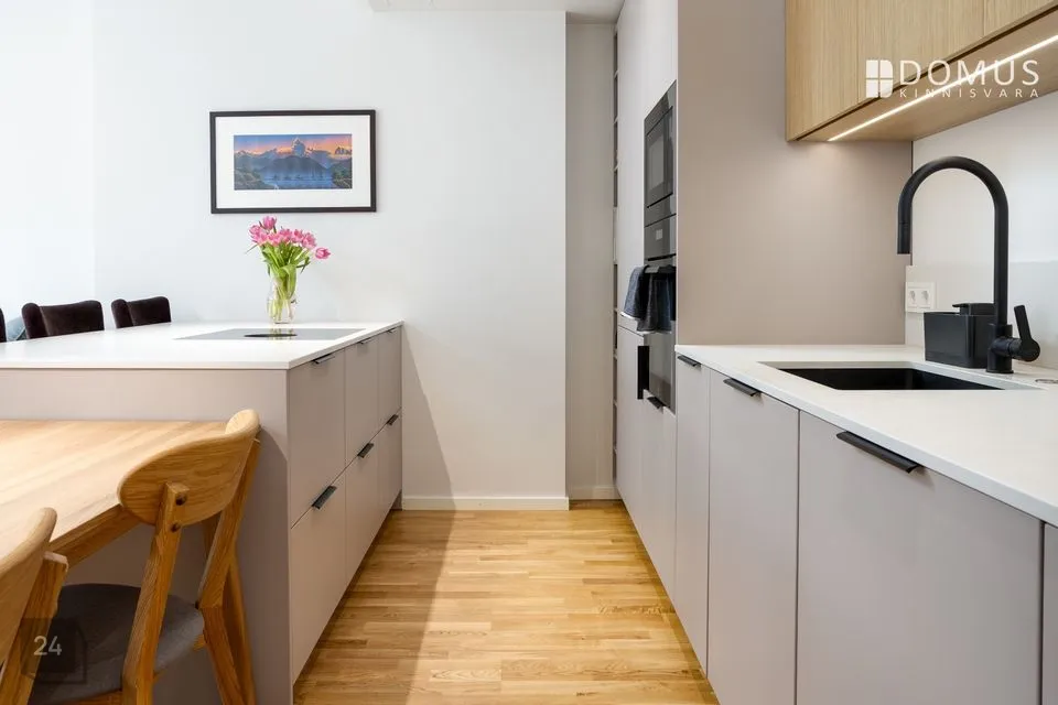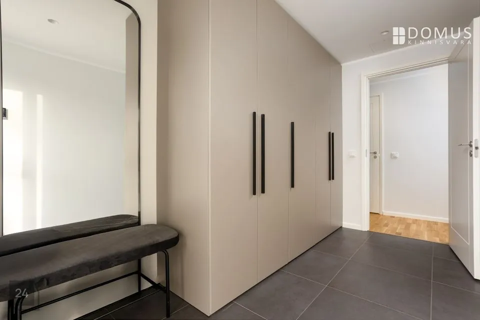 Korteri siseviimistluses on kasutatud kvaliteetseid materjale: seinad on värvitud heledates toonides, laed on viimistletud valgeks, eluruumide põrandaid katab naturaalne tammeparkett ning niisked ruumid ja esikupõrand on plaaditud keraamiliste plaatidega. Kodu südameks on köök ning sellesse korterisse on paigaldatud kvaliteetne ja funktsionaalne Arens köögimööbel koos integreeritud tehnikaga. Lisaks on korteris rohkelt panipaiku – esikus ootab teid mahukas garderoobikapp ning suure magamistoa juurde kuulub avar walk-in garderoob, mis tagab maksimaalse mugavuse ja hoiuruumi.