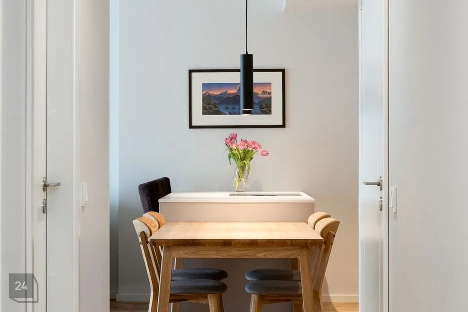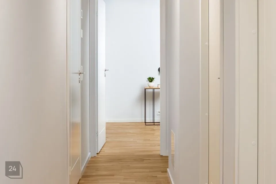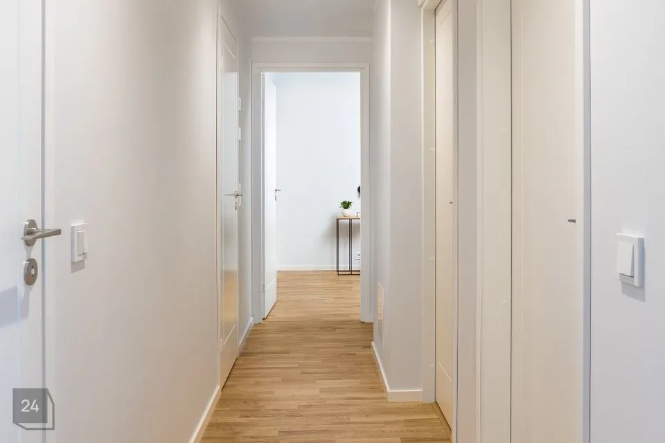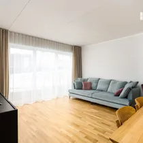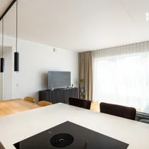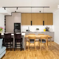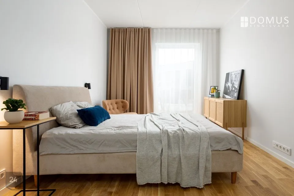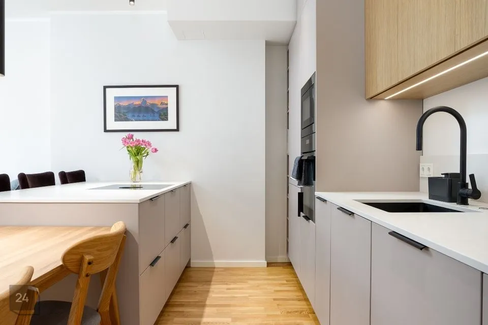 Korteri siseviimistluses on kasutatud kvaliteetseid materjale: seinad on värvitud heledates toonides, laed on viimistletud valgeks, eluruumide põrandaid katab naturaalne tammeparkett ning niisked ruumid ja esikupõrand on plaaditud keraamiliste plaatidega. Kodu südameks on köök ning sellesse korterisse on paigaldatud kvaliteetne ja funktsionaalne Arens köögimööbel koos integreeritud tehnikaga. Lisaks on korteris rohkelt panipaiku – esikus ootab teid mahukas garderoobikapp ning suure magamistoa juurde kuulub avar walk-in garderoob, mis tagab maksimaalse mugavuse ja hoiuruumi.