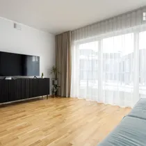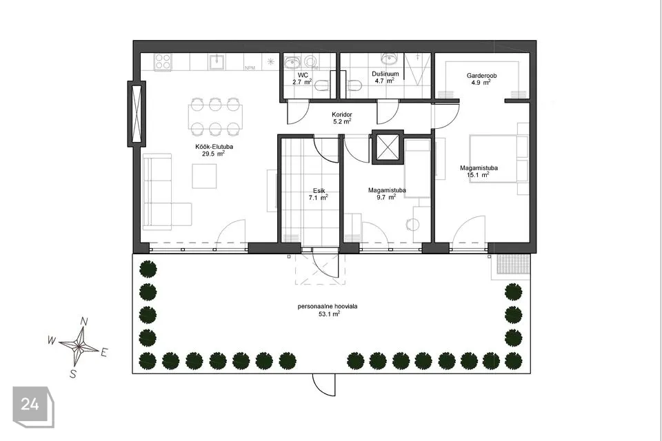 Korter on avara ja läbimõeldud planeeringuga, pakkudes ideaalset elukeskkonda nii peredele kui ka neile, kes hindavad privaatsust ja rohelust. Elutoa ja köögi (29,5 m²) avatud lahendus loob ruumikuse ning valgusküllase õhkkonna, samal ajal kui kaks magamistuba (15,1 m² ja 9,7 m²) tagavad hubasuse ja rahu. Suurima magamistoa juurde kuulub ka praktiline walk-in garderoob (4,9 m²), mis pakub rohkelt panipaika. Lisaks on korteris kaks eraldi sanitaarruumi – eraldi WC (2,7 m²) ning pesuruum koos tualetiga (4,7 m²), tagades mugavuse igapäevaelus.