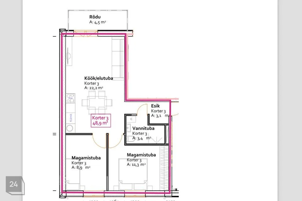 Korteri suletud pind on 48,9 m2, millele lisandub rõdu 4,5 m2. Korteri juurde kuulub kasutuskorra alusel 1 parkimiskoht ja 1 panipaik.