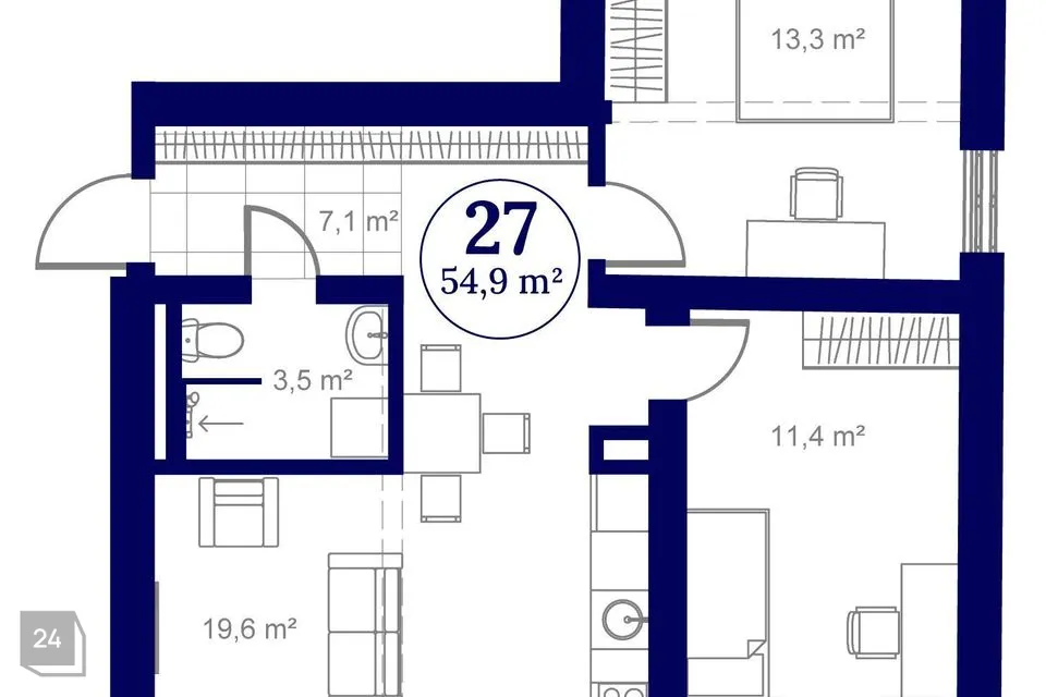 Korter asub 1.korrusel ja akendest avanevad vaated maja ette ja ühele küljele õhtupäikese suunas. Korter koosneb esikust, avatud köögiga elutoast, kahest magamistoast ja duširuum-tualetist - üldpinnaga kokku 54,9 m2.