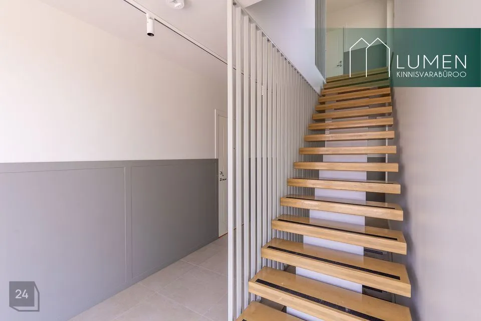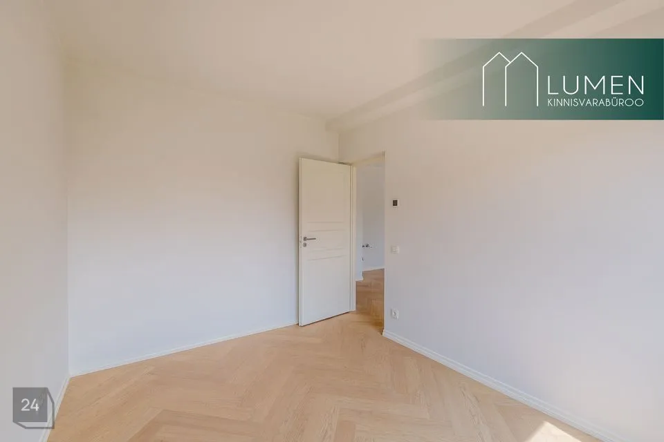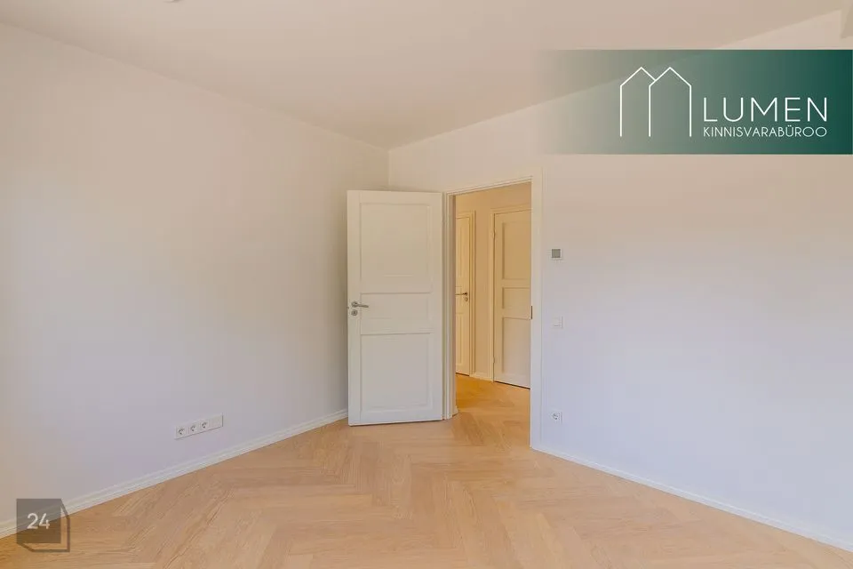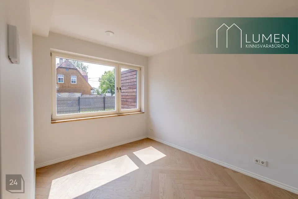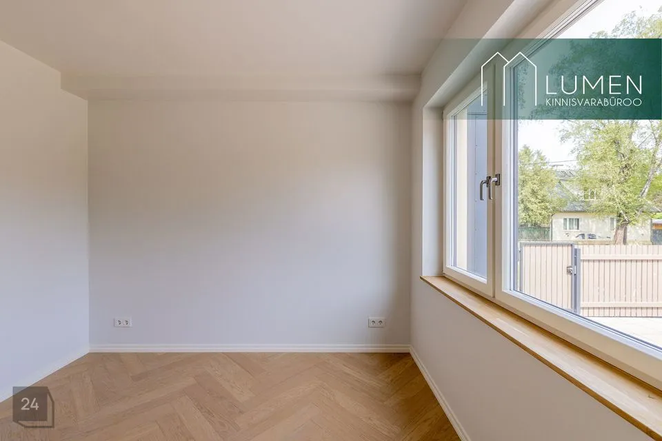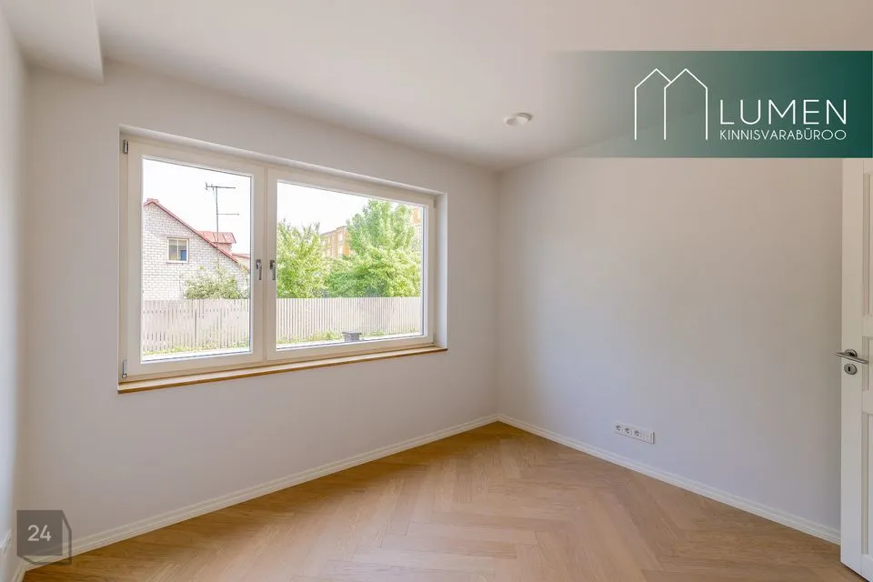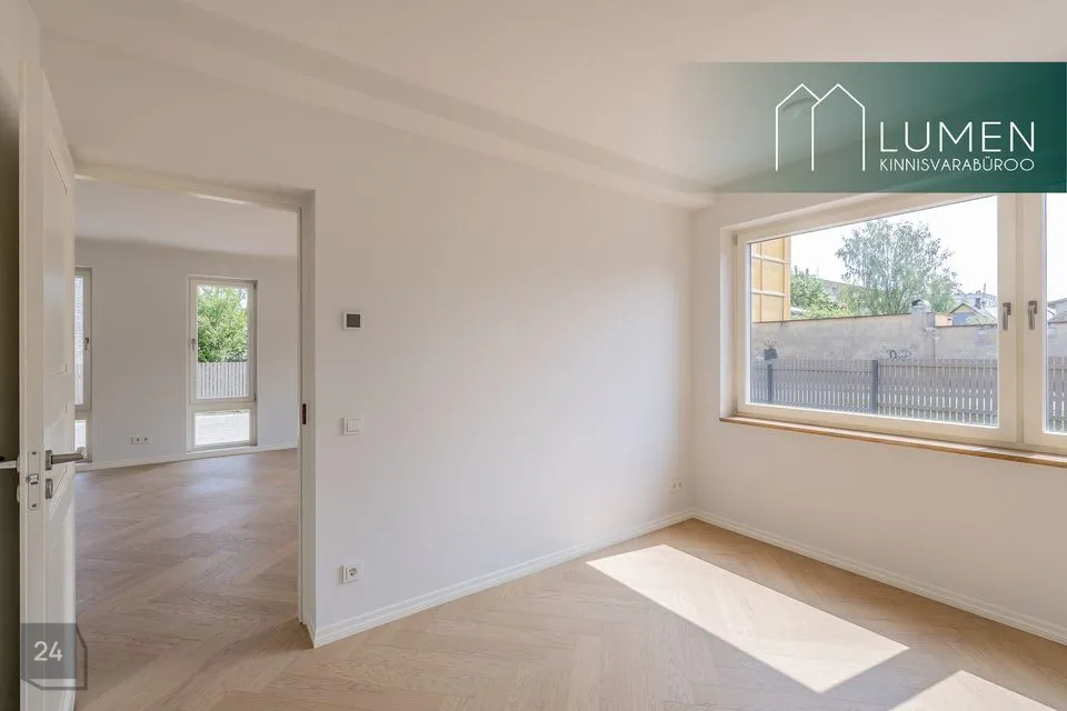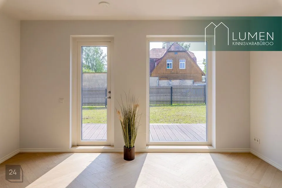 1. korruse korteri eluruumi pind on kokku 67 m², mis koosneb garderoobikohaga esikust, kahest magamistoast (ühe magamistoa aknad avanevad sisehoovi ja teise magamistoa aknad jäävad terrassi poole) ja valgusküllasest ning avarast köök-elutoast, kust pääseb ka otse 14,7 m2 suurusele terrassile. Loomulikult on olemas ka eraldi WC-ruum esikus ning suur duširuum koos leiliruumi ning lisa WC-ga. Duširuumi seinad on kaetud efektplaadiga ning laed termopuiduga. Olemas on kvaliteetsed Villeroy & Bochi valamukapp ja segistid, Hansgrohe dušisegisti, klaasseinaga eraldatud vaikselt sulguv seinapott ning leiliruumis on LED-valgustusega lava ja Huumi elektrikeris. Valgusküllastes eluruumides on põrandakatteks liimitud kalasaba puitparkett ja niiskete ruumide põrandad ning seinad on kaetud keraamilise plaadiga. Erilist rõhku on pandud kvaliteetsele viimistlusele ja naturaalsusele, mida ilmestavad puidust aknalauad, põrandaliistud ja siseuksed. Olemas on ka panipaik keldrikorrusel ning üks parkimiskoht sisehoovis.