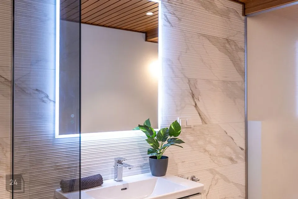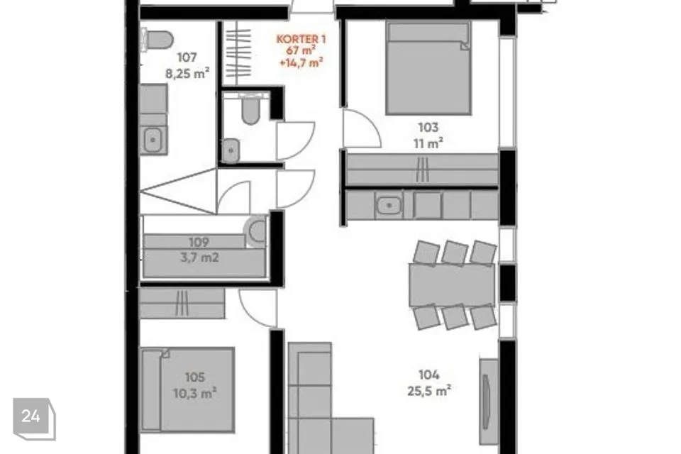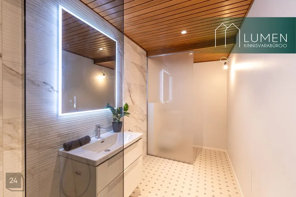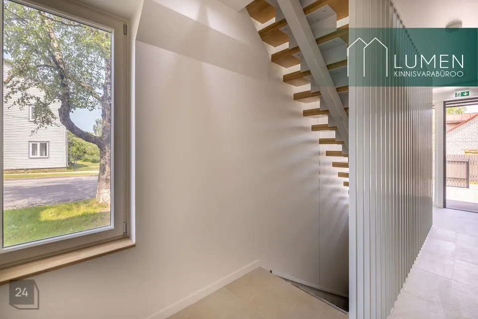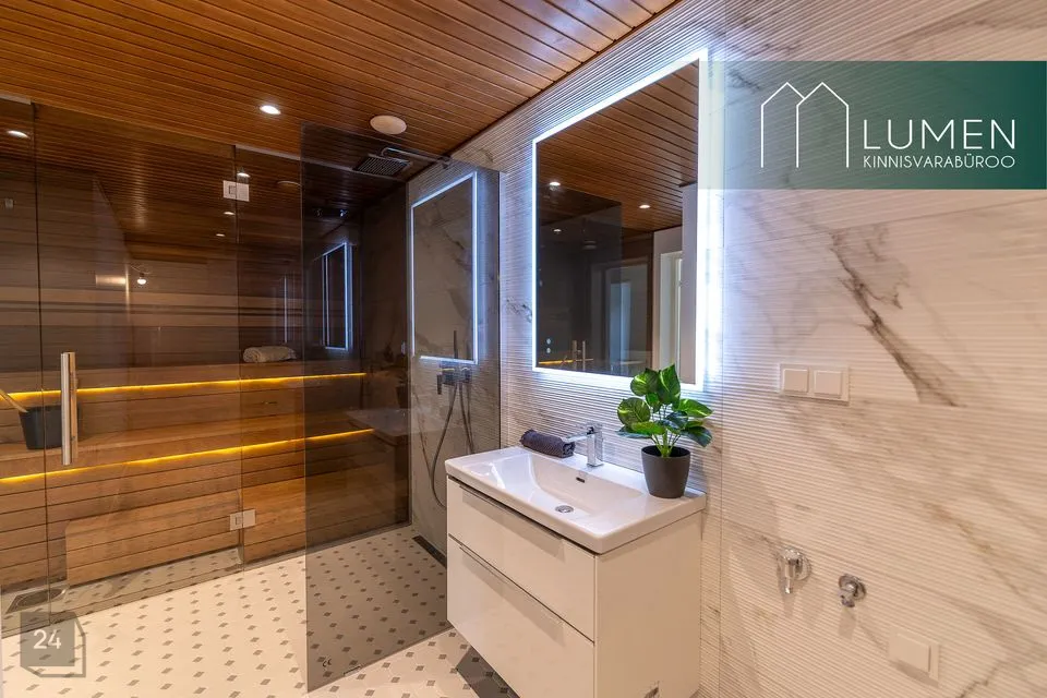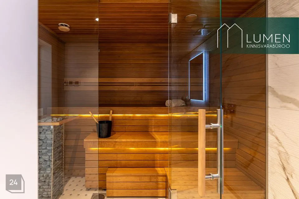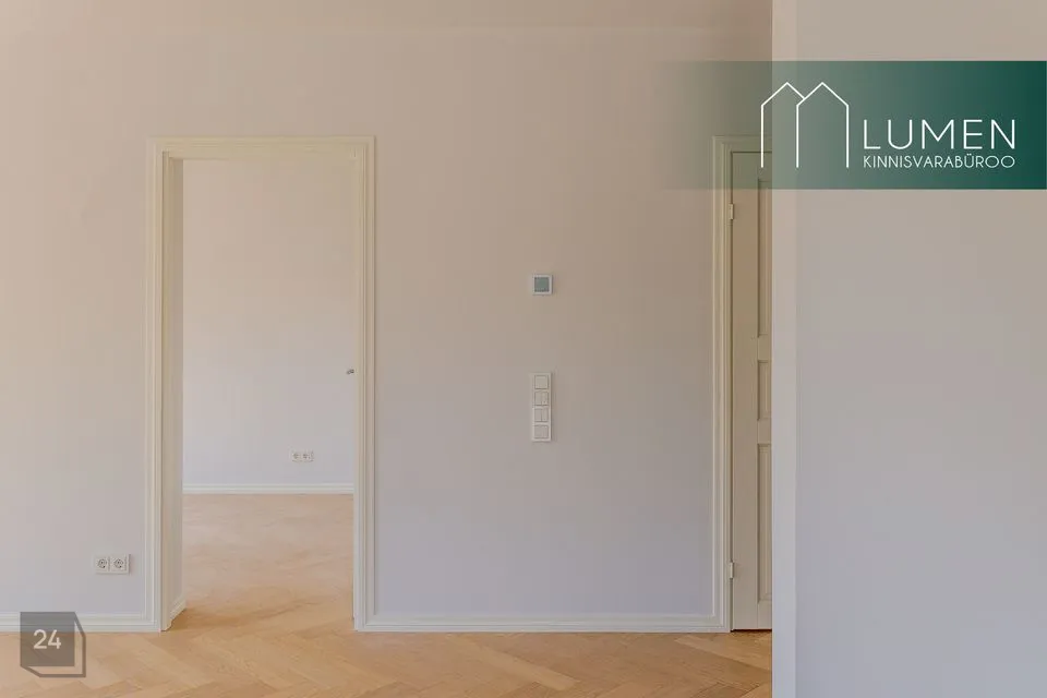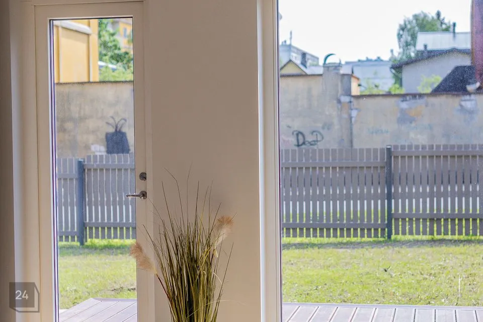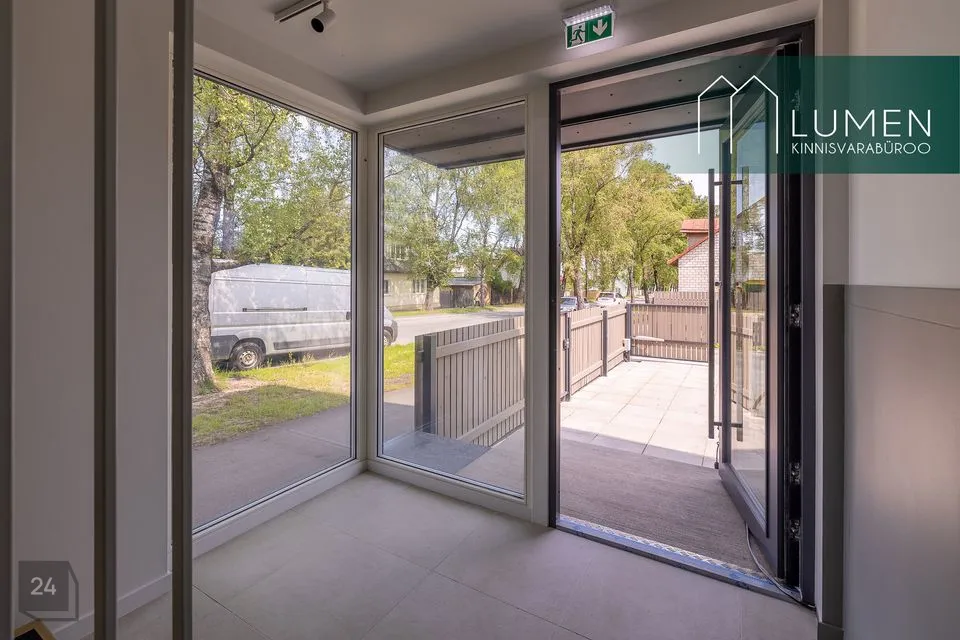 1. korruse korteri eluruumi pind on kokku 67 m², mis koosneb garderoobikohaga esikust, kahest magamistoast (ühe magamistoa aknad avanevad sisehoovi ja teise magamistoa aknad jäävad terrassi poole) ja valgusküllasest ning avarast köök-elutoast, kust pääseb ka otse 14,7 m2 suurusele terrassile. Loomulikult on olemas ka eraldi WC-ruum esikus ning suur duširuum koos leiliruumi ning lisa WC-ga. Duširuumi seinad on kaetud efektplaadiga ning laed termopuiduga. Olemas on kvaliteetsed Villeroy & Bochi valamukapp ja segistid, Hansgrohe dušisegisti, klaasseinaga eraldatud vaikselt sulguv seinapott ning leiliruumis on LED-valgustusega lava ja Huumi elektrikeris. Valgusküllastes eluruumides on põrandakatteks liimitud kalasaba puitparkett ja niiskete ruumide põrandad ning seinad on kaetud keraamilise plaadiga. Erilist rõhku on pandud kvaliteetsele viimistlusele ja naturaalsusele, mida ilmestavad puidust aknalauad, põrandaliistud ja siseuksed. Olemas on ka panipaik keldrikorrusel ning üks parkimiskoht sisehoovis.