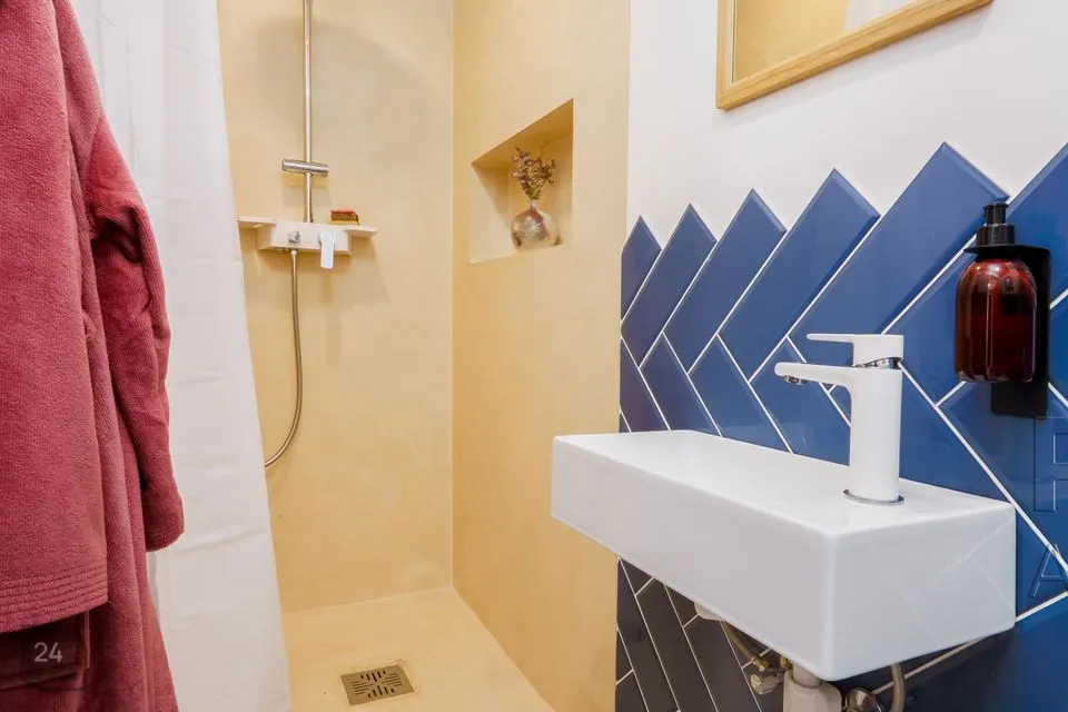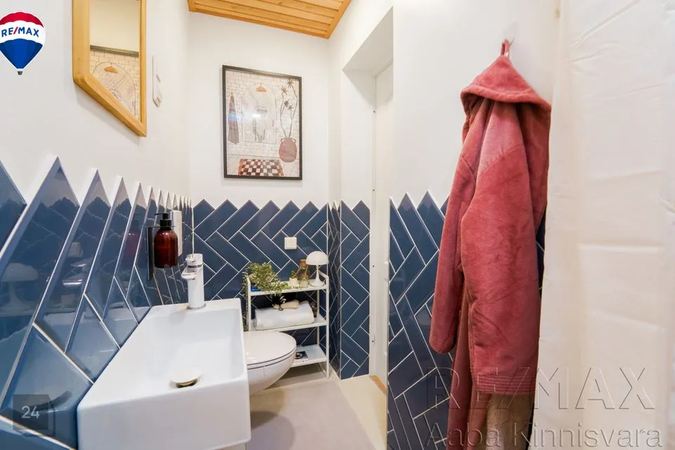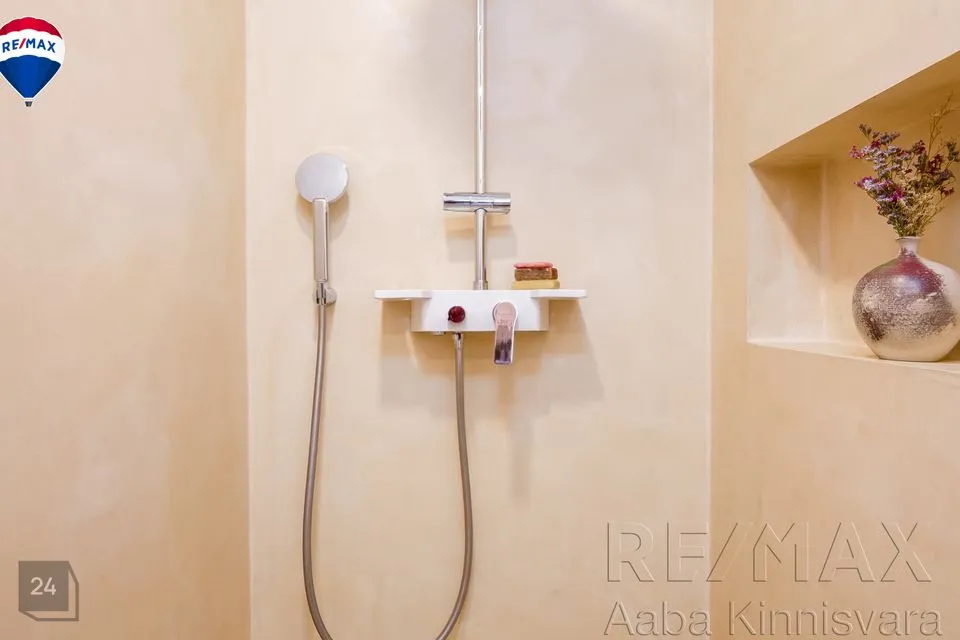 WC-dushiruum plaaditud ja seinad värvitud , dušinurgas on kasutatud stiilset mikrotsementi, mis on niiskuskindel.