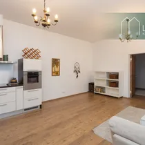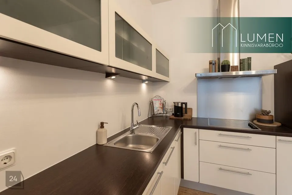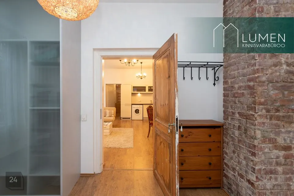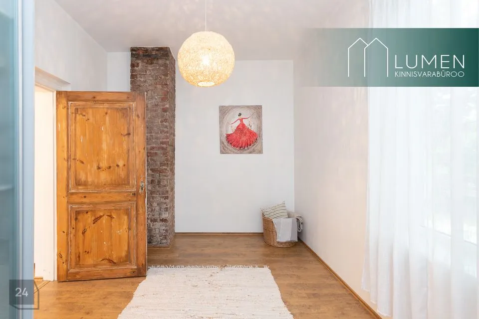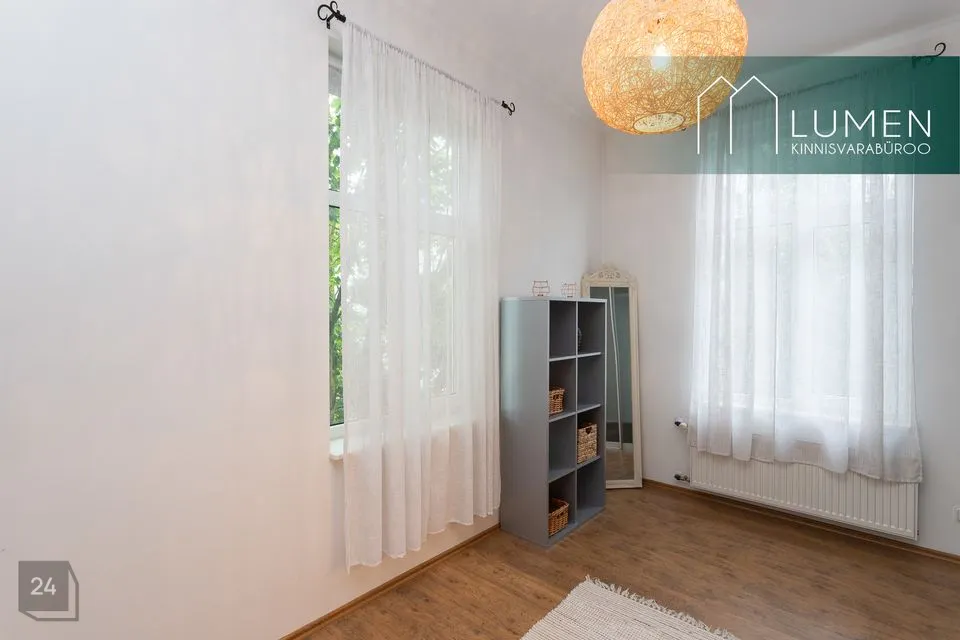 52,1 m2 suuruse eluruumi pinnaga 2. korruse korter koosneb esikust, WC-duširuumist, köök-elutoast ja magamistoast. Korteri muudavad eriliseks kõrged laed ning eriti avarad eluruumid. Malbetes toonides elutoas on lausa kolm kõrget akent, mis muudavad ruumi eriti valgusküllaseks. Olemas on nurgadiivan, seinateler, tumba ja kohvilaud. Köögiosas asub elektripliit, kubu, nõudepesumasin, elektriahi, külmik ja mööbel, lisaks ka pesumasin riietele. Suures korteris on piisavalt ruumi ka söögilauale ja toolidele.