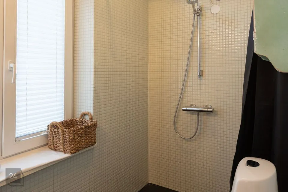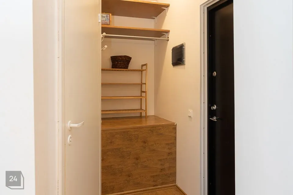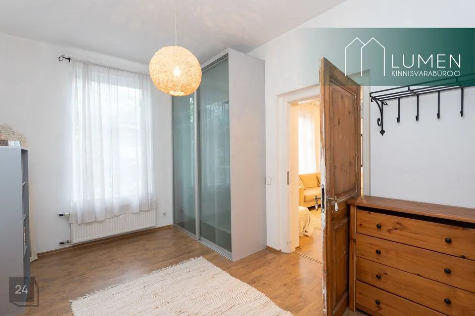 Stiilselt sisustatud korteri magamistuba on nurgapealne koos kahe valgusküllase aknaga. Tuba on varustatud suure ja mahuka garderoobikapiga. Elektrilise põrandaküttega WC-duširuumis, mille seinad ja põrandad on kaetud keraamiliste mosaiikplaatidega, on olemas valamukapp ja peegel. Eluruumide akendeks on mitmekordsed pakettraamid ja põrandakatteks on laminaatparkett. Mööbel kuulub müügihinna sisse. Parkimine toimub tõkkepuu taga sisehoovis.
