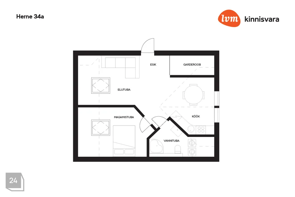 Korter on avatud köögi ja avara elutoaga, mis avaneb eraldi magamistuppa, garderoobi ja vannituppa.