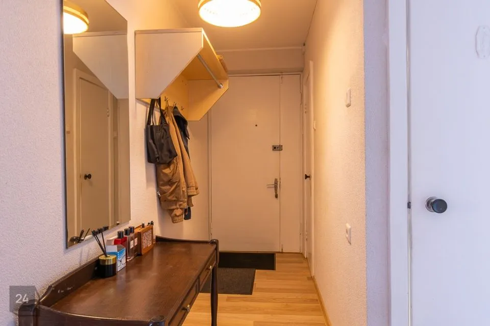Tegemist on kahetoalise korteriga, mis asub 5-korruselise kortermaja 5. korrusel ja mille eluruumi pindalaks on 44,4 m². Korter on hea planeeringuga ning vaated avanevad nii maja ette kui ka taha. Korterisse sisenedes pääseb esikusse, millest vasakule jääb tualett. Koridorist edasi liikudes jääb vasakule köök ja pääs vannituppa. Korist otse paikneb elutuba ja vasakule küljele jääb magamistuba, kus on mõnus rõdu vaatega kõrghaljastusega tagahoovi.