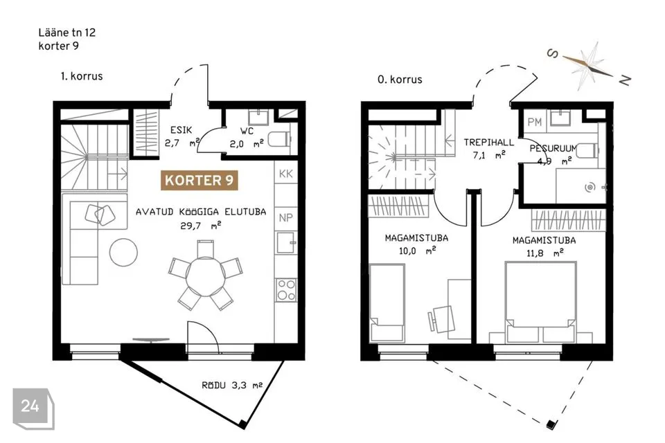 Müüdava korteri suletud netopindala on 68,20 m2, millele lisandub 3,3 m2 suurune rõdu. Korter paikneb läbi kahe korruse. 1. korrusel on esik, avatud köögiga elutuba ja wc ning 0. korrusel on kaks magamistuba ja duširuum-wc. Korteri hind sisaldab lõplikku siseviimistlust. Eluruumi põrandatele on parkett, seinad ja laed värvitud. San. ruumide seinad ja põrandad plaaditud ning paigaldatud sanitaartehnika (wc-pott, kraanikauss, dušisegisti).