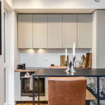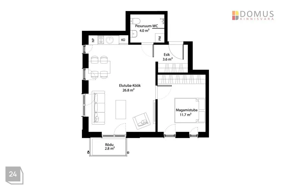 Elutuba-köök 26,8 m² – valgusküllane ja nutikalt lahendatud tuba koos täisfunktsionaalse köögi ja integreeritud tehnikaga.