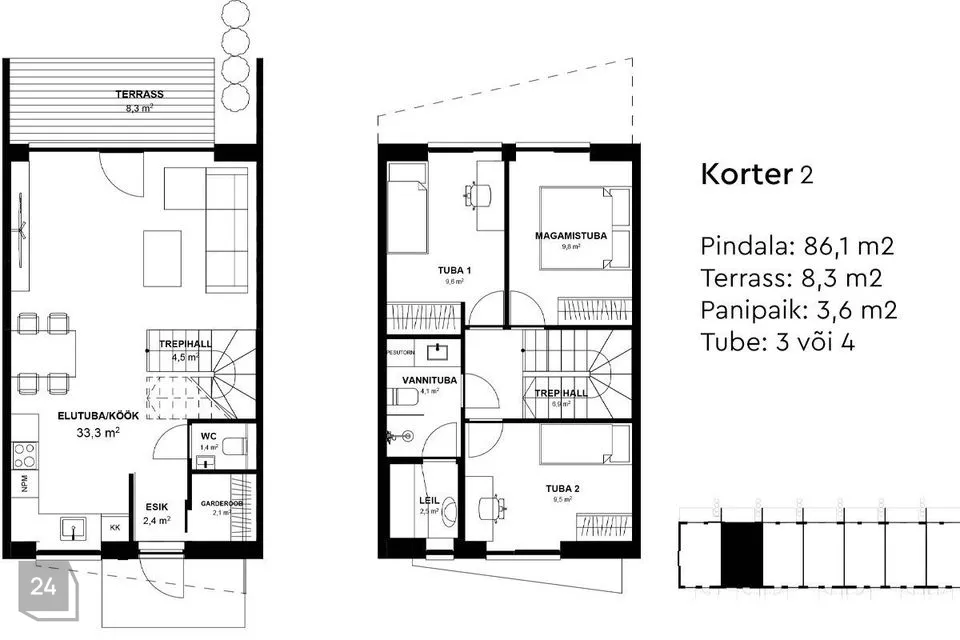Pildigaleriis on leitav kõnealuse ridaelamuboksi toalisus ning planeering.