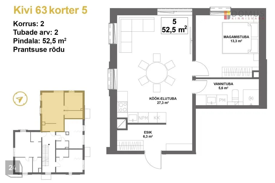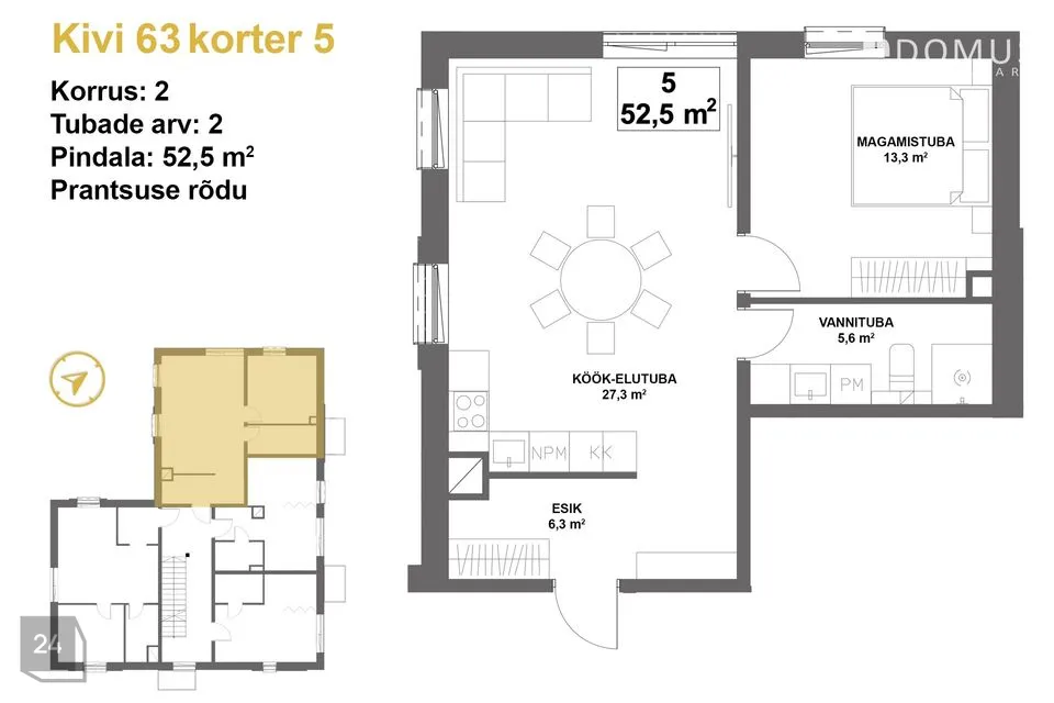 See avar 2-toaline 52,5 m² korter paikneb arendatava maja teisel korrusel ning on ideaalne kodu neile, kes soovivad praktilist planeeringut ja kesklinna lähedust. Korteri südameks on 27,3 m² suurune köök-elutuba, mis pakub avarust ja valgusküllasust nii igapäevaeluks kui ka külaliste vastuvõtuks. Lisaks kuuluvad planeeringusse eraldi magamistuba, ruumikas vannituba ning mugav esik.