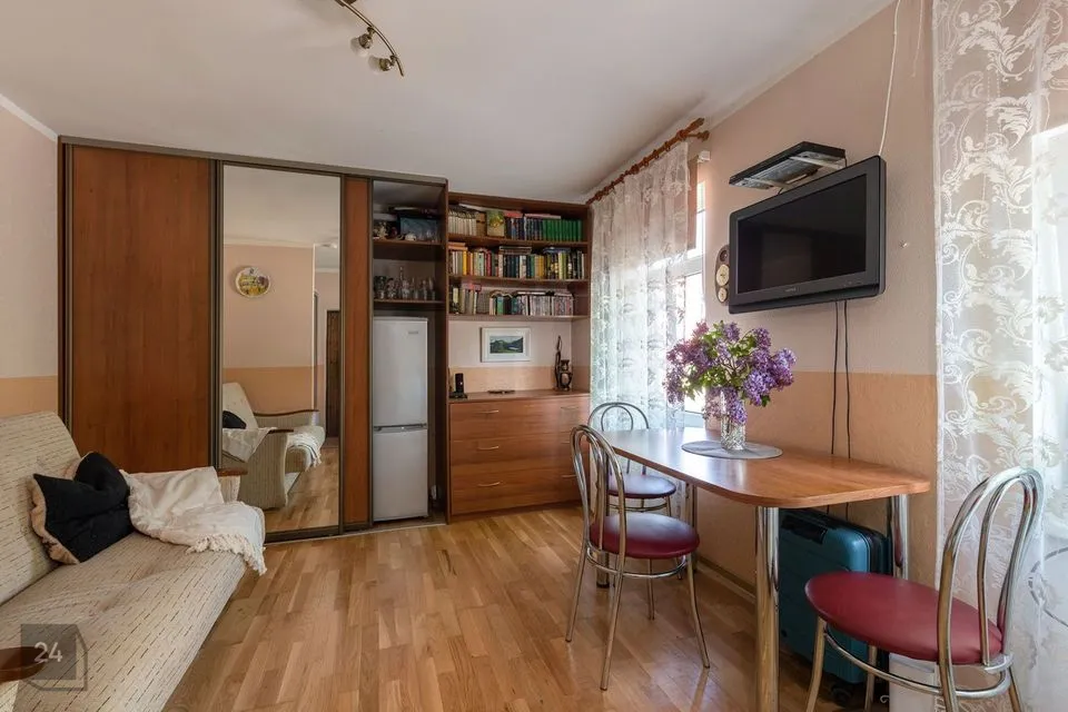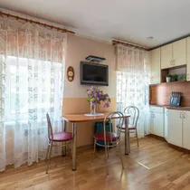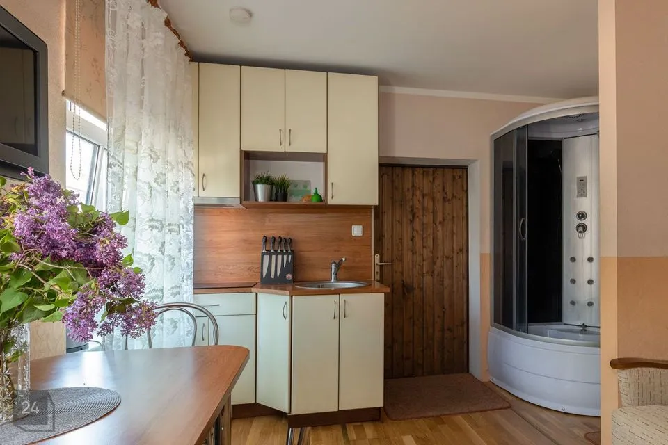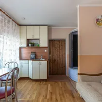 Korteris on olemas kõik vajalik: miniköök, mis sisaldab õhupuhastit, keraamilist pliidiplaati, külmutuskappi ning söögilauda ja toolid.