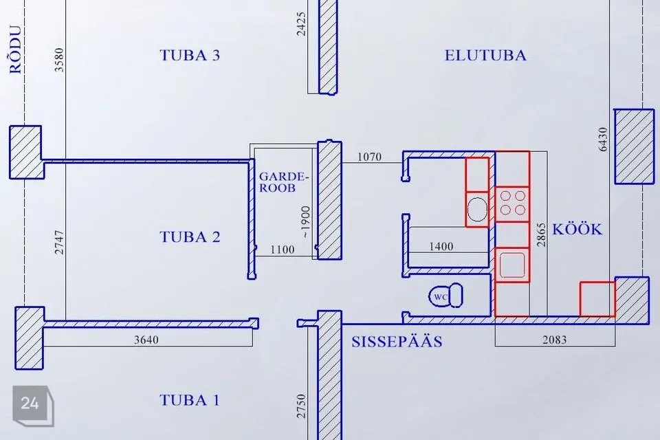 Korteris on esik, avatud köögiga elutuba, kolm magamistuba, garderoobiruum, vannituba ja tualettruum.