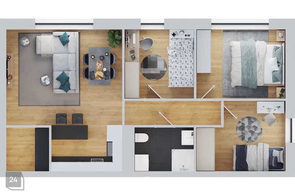 Ruumiplaneeringult: esik, elutuba- köök, 3 magamistuba ja pesemisruum. Korteri juurde kuulub 2 kindlat parklakohta maja all olevas parklas lisaks on keldrikorrusel lukustatav panipaik pindalaga 4,8 m2
