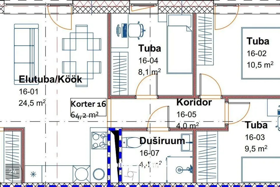 Korteris olemas kõik eluks vajalik mööbel ja tehnika.