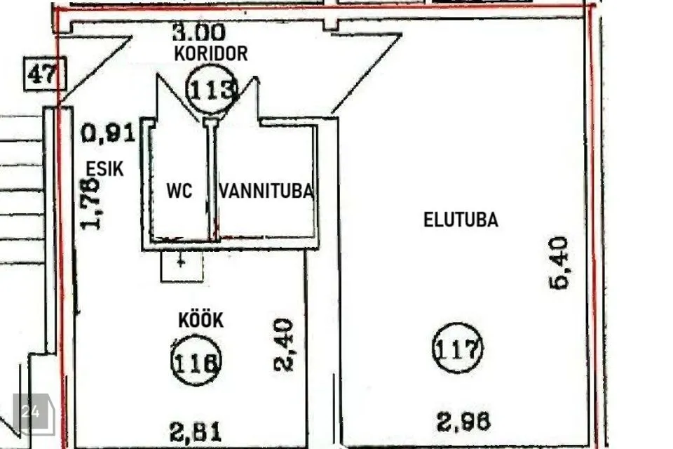 Esik, ning eraldiseisvad WC ja vannituba. Paremale jääb köök ning esikust otse edasi elutuba. Planeering on lisatud ka pildigalerii lõppu.
