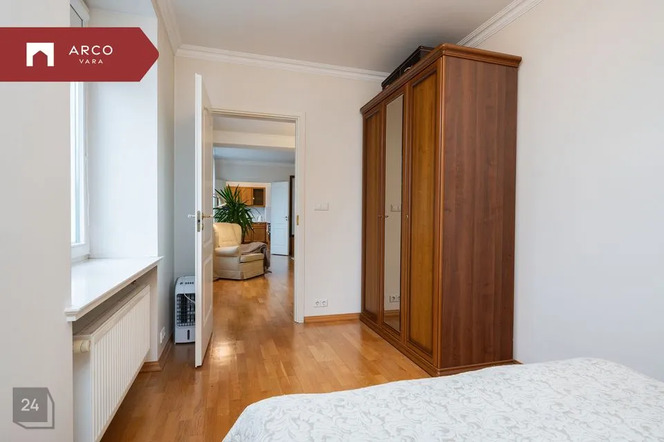 Korteri keskpunkt on suur ja valgusküllane elutuba. Algselt kolmetoalisest lahendusest on kujundatud avar kahetoaline korter. Köök on ruumikas ja suure tööpinnaga ning seda saab elutoast eraldada kahepoolsete ustega. Elutoast pääseb magamistuppa, mis on mugava suurusega. WC ja vannituba on ühendatud. Esikuala eraldab elutoast mahukas garderoobikapp.
