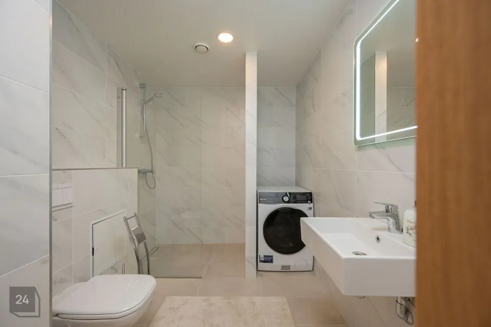 Duširuum on möbleeritud ning hinnas sisalduvad valamu, valgustusega peegel ja pesumasin.