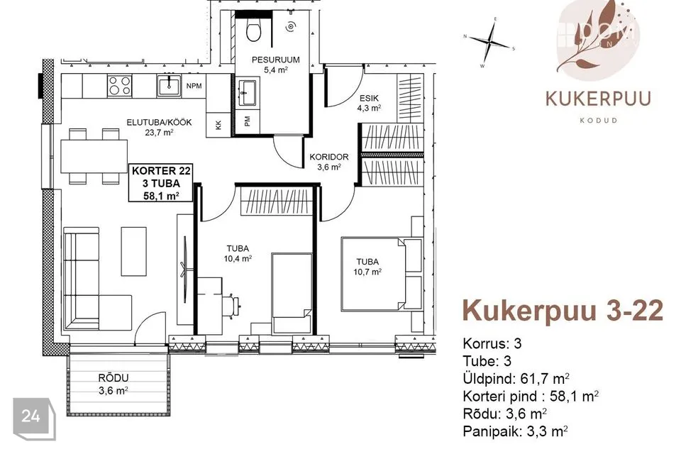 Korteril avar esik 4,3m², koridor 3,6m², elutuba-köök 23,7m², millest pääseb avarale rõdule 3,6 m², pesemisruum 5,4m², magamistuba 10,4m²,magamistuba 10,7m²