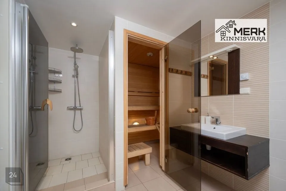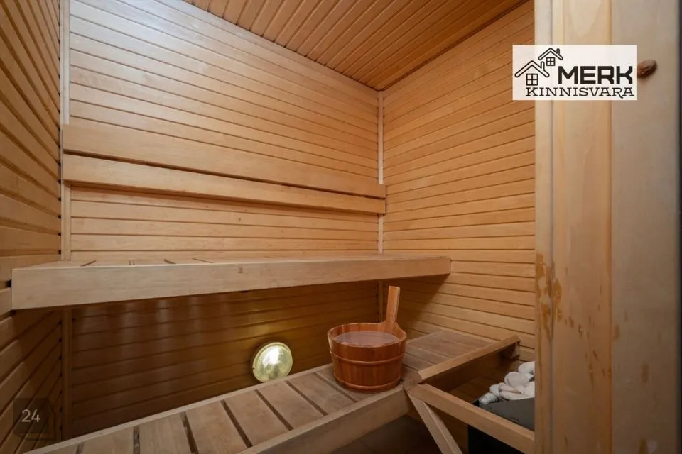 Korteris on avatud köögiga elutuba, kaks magamistuba, mahukas garderoob, dušiga vannituba ja saun.