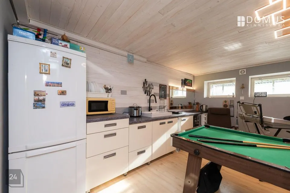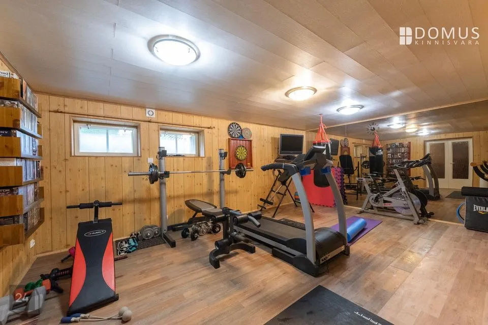 Kõige alumisel korrusel on nn hobiruumid, kus eraldi köök ja mida võiks kasutada ka laste elamise ruumidena. Sealne kamin on vaid dekoratiivse iseloomuga ja ei ole mõeldud päris küttekaminana, kuid annab effekti siiski. Alumisel korrusel on ka jõusaal/sauna eesruum, eraldi wc ja saun koos pesuruumidega. Lisaks on veel eraldi sissepääsuga korraliku suurusega töötuba kus saab tegeleda näiteks puidutöö hobiga vms.