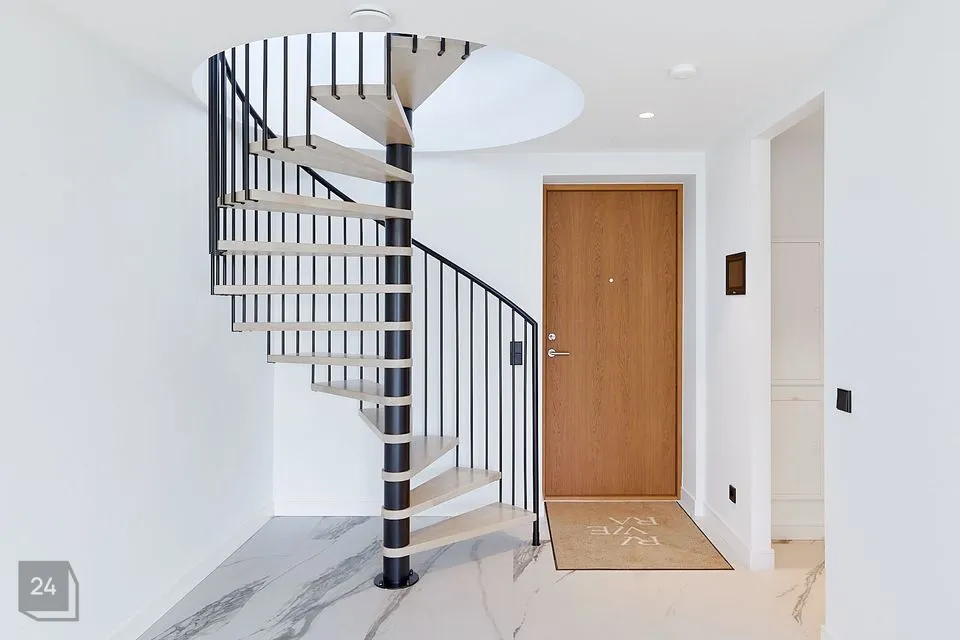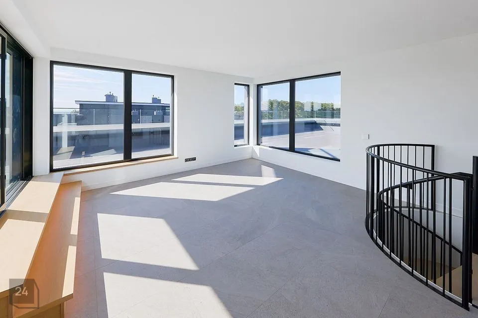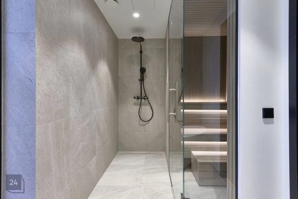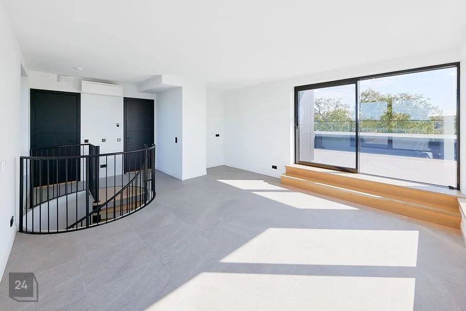 Stiilne trepp viib korteri ülemisele korrusele, kus avaneb luksuslik elutsoon – erakordselt avar elutuba, mille akendest ja otse terrassilt avaneb lummav vaade merele. Selle korruse keskmes on spaalikult elegantne saun koos vanniga ja puhkealaga – ideaalne koht lõõgastumiseks pärast pikka päeva. Elutoast viib otsepääs päikeselisele terrassile, kus saab nautida hommikukohvi või võõrustada külalisi romantilise merevaatega õhtusöögil. Terrassil on ka mullivanni paigaldusvalmidus, et tõsta kodune luksus veelgi uuele tasemele.