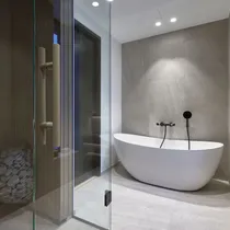 Selle korteri interjöör on kujundatud vastavalt siseviimistluspaketile Süvameri. Põrandaid katab kvaliteetne helehallis toonis tammeparkett BOENilt ning magamistubades pehme vaipkate. Vannitubades on kaunid liivamustriga plaadid, mida ilmestavad luksuslikud matt musta viimistlusega segistid.