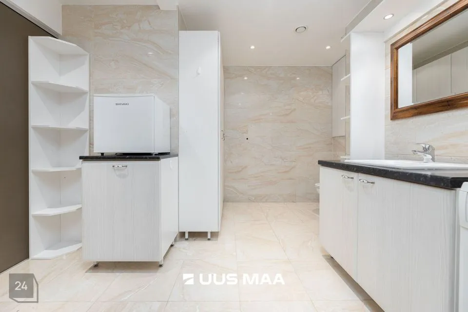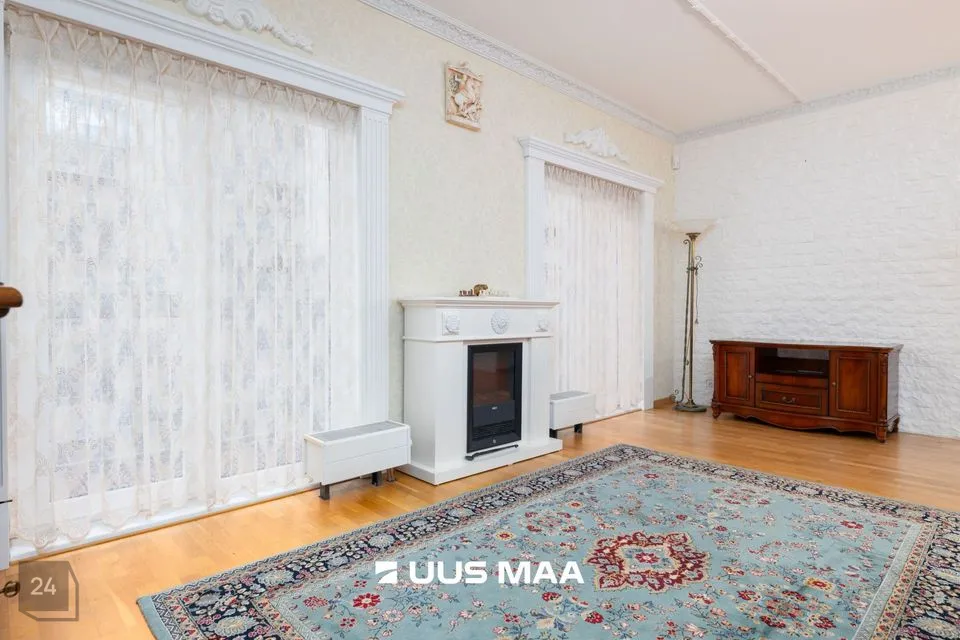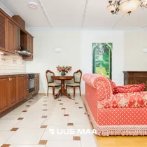 Elutoa südameks on kaunis dekoratiivkamin, mis lisab luksuslikust. Elutoa seinu kaunistab valge tellismustriga efektsein ning laes on klassikalises stiilis lühter. Köögiosas on täispuidust esipaneelidega köögimööbel ning integreeritud tehnika.