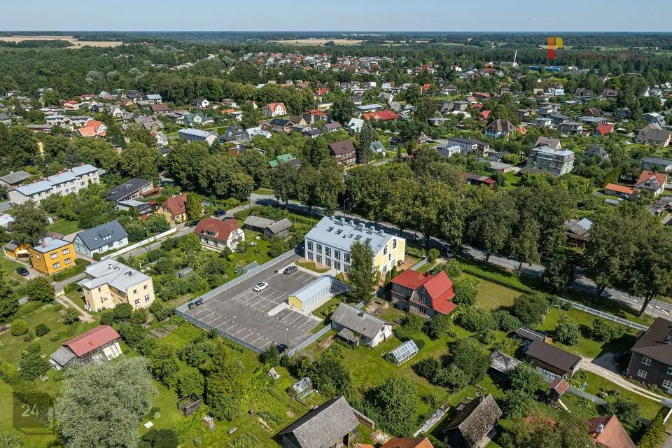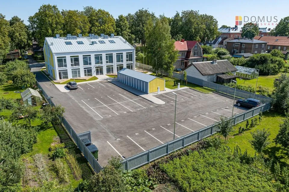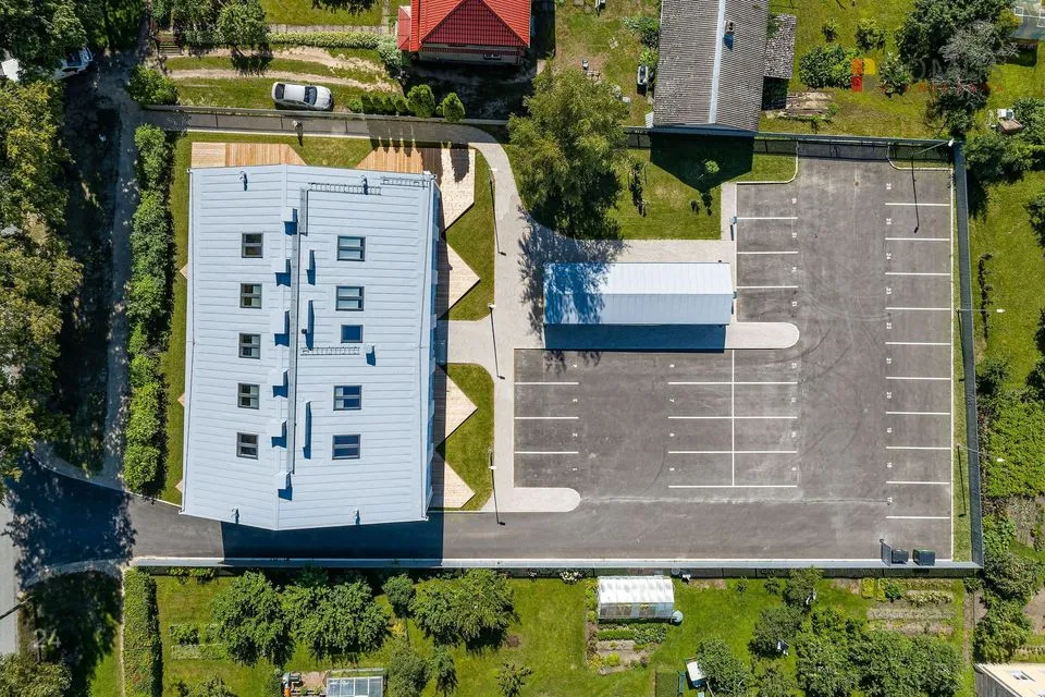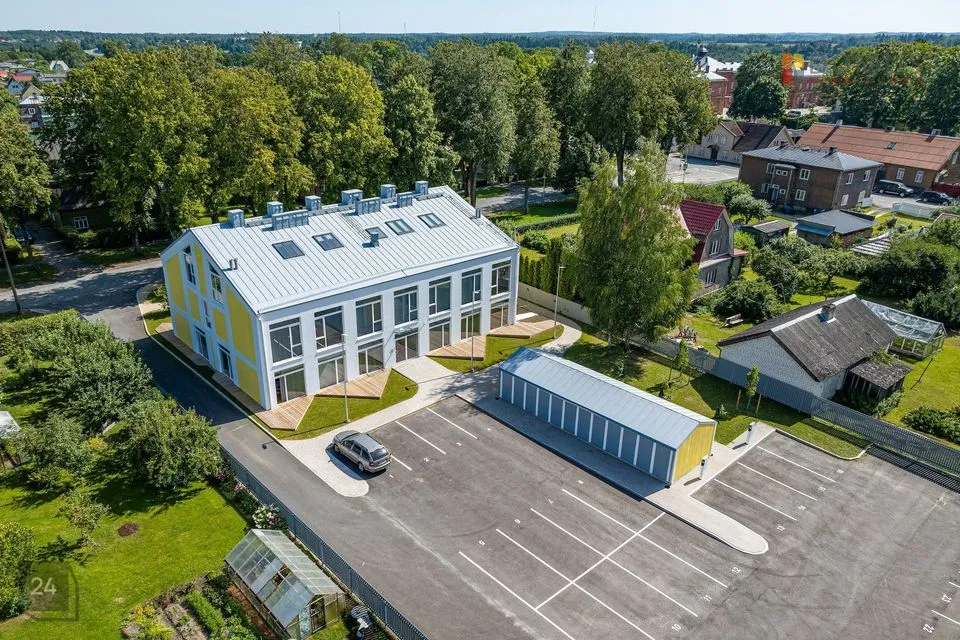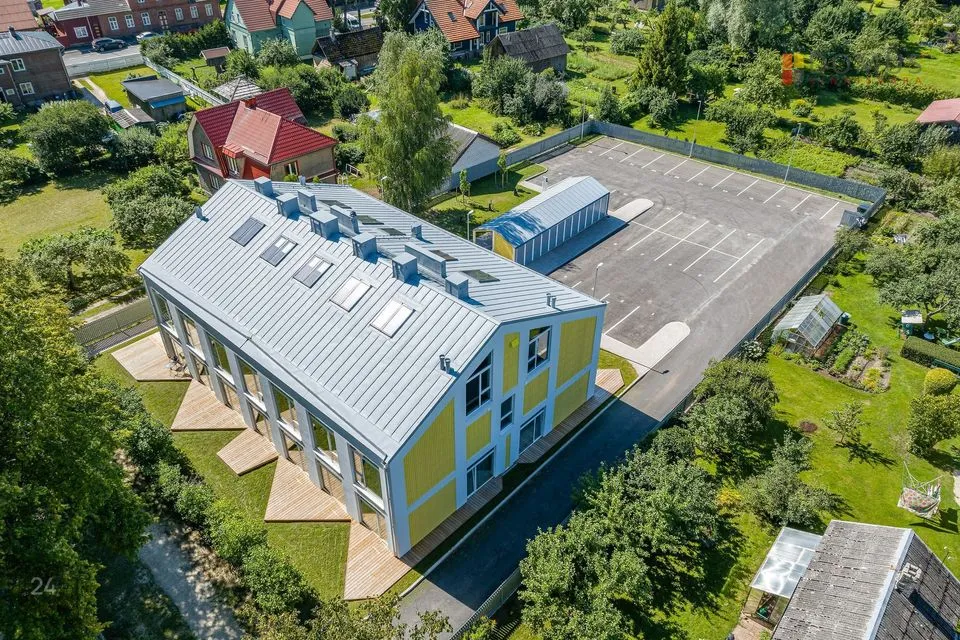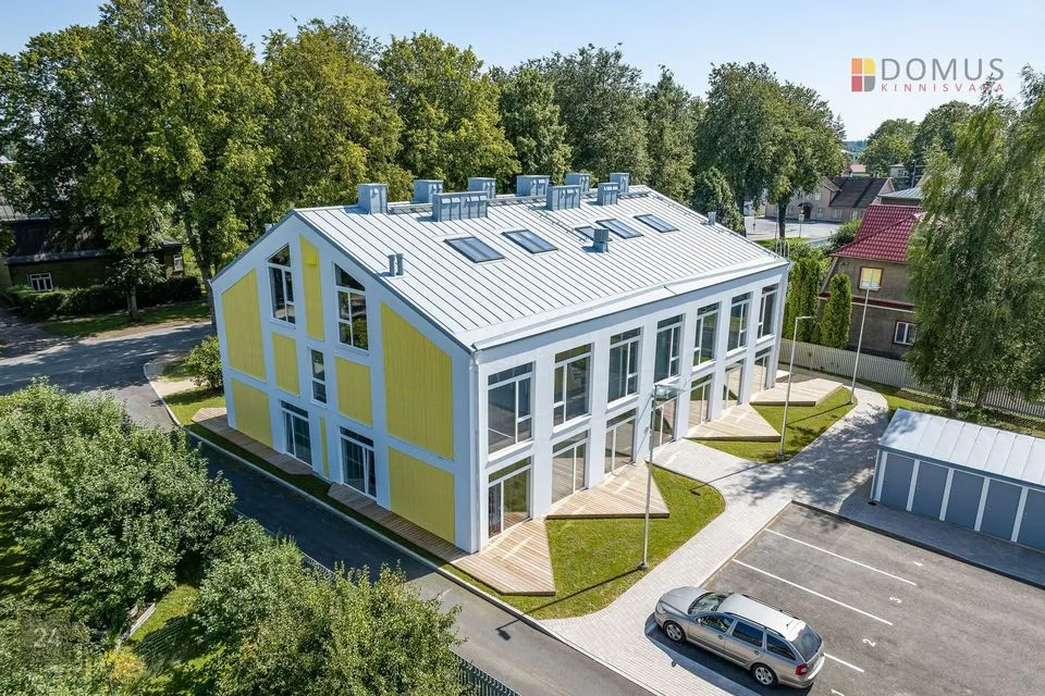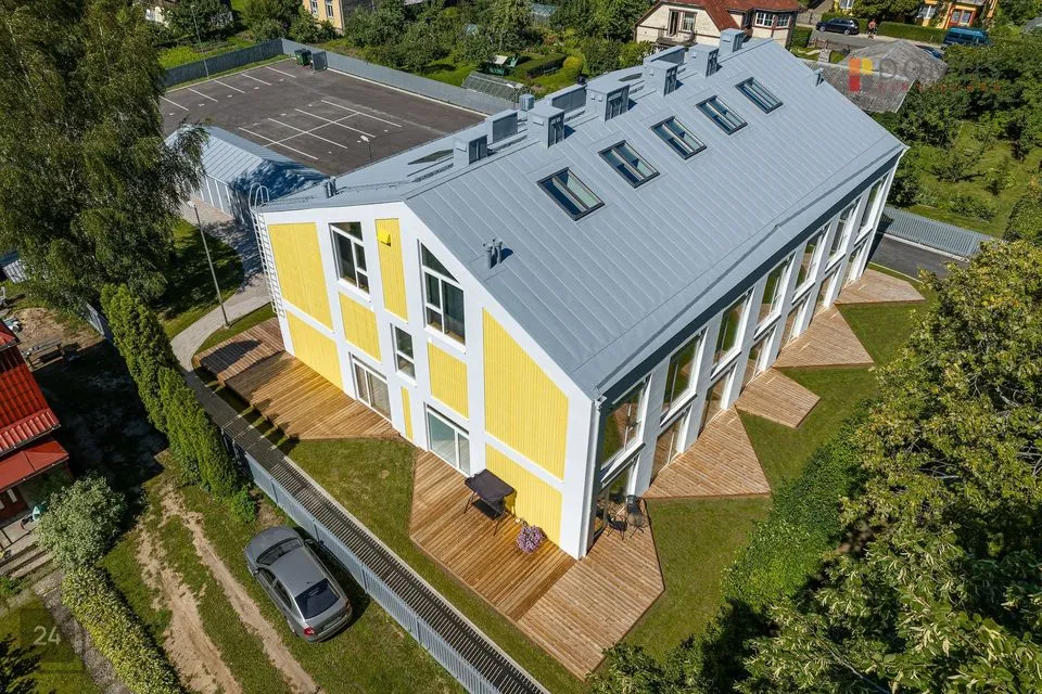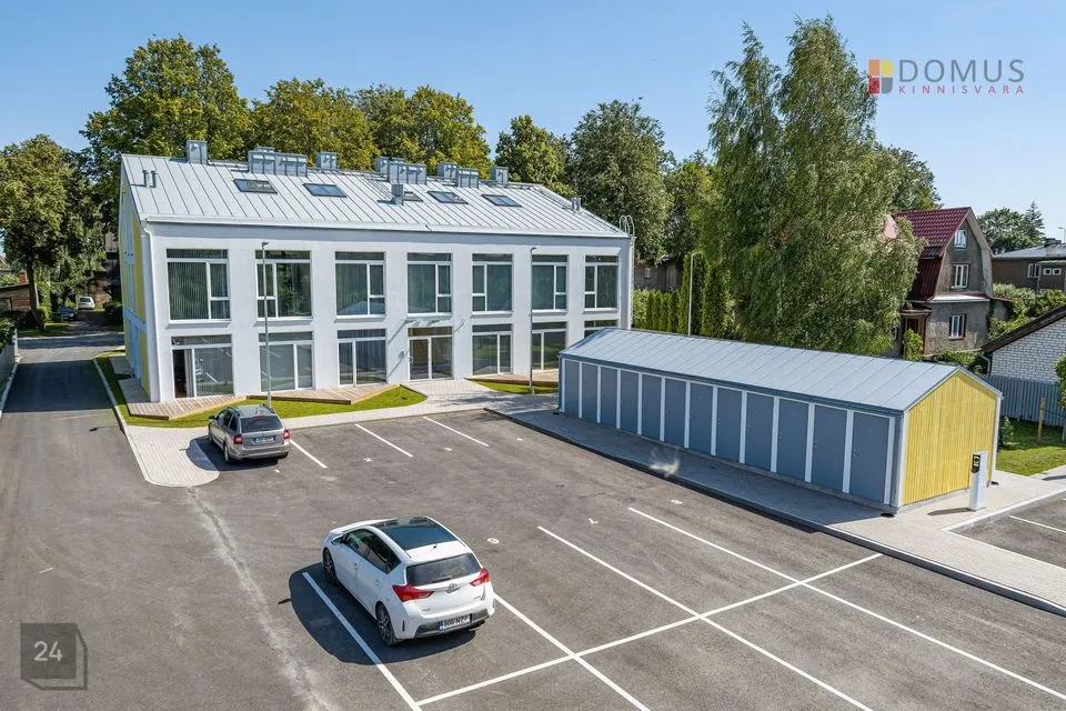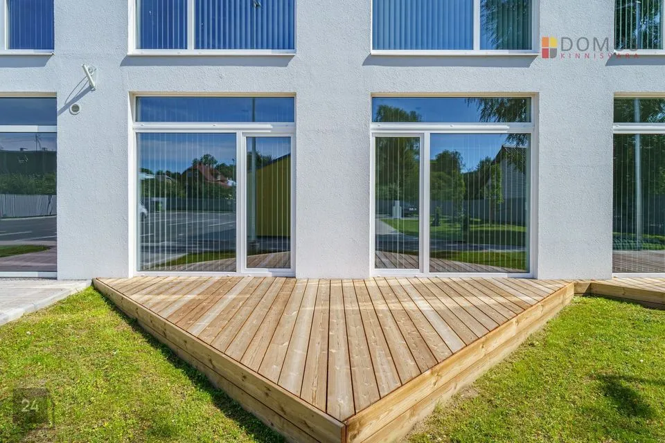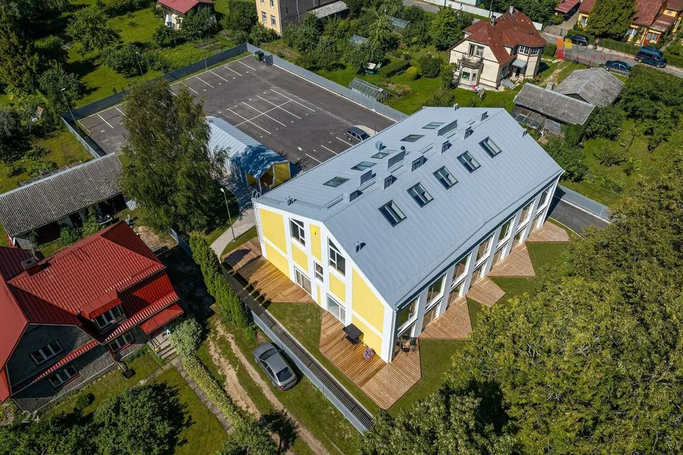 Stiilse välisilmega hoones, mille otsaseinad on kombineeritud maitsekalt ajatuks tervikuks krohvi ja puiduga ning kuhu õhulisust ja elegantsi lisavad suured klaaspinnad fassaadil.