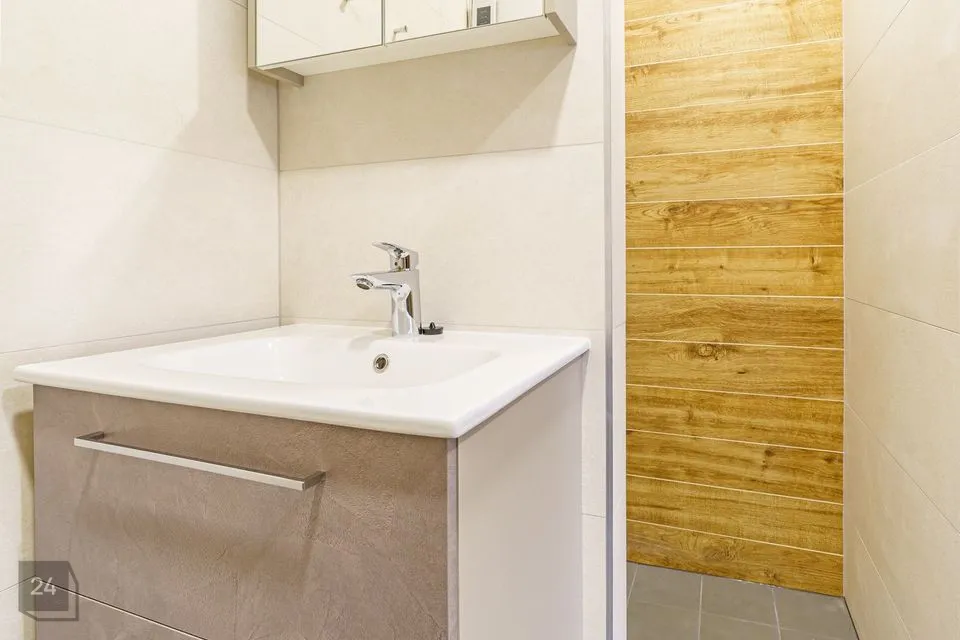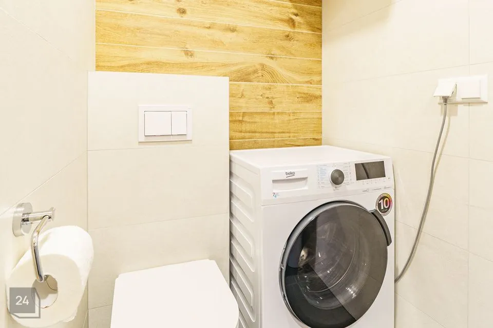 • Sisustatud duširuum: peegelkapp, kraanikausi alused sahtlid, kuivatiga pesumasin.