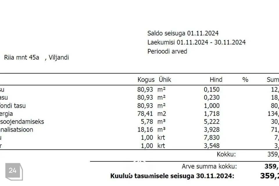 KÕRVALKULUD: kõikidele arvetele lisandub remondifond 81€: oktoobris 250€, novembris 278€, juunis 150€. Mõned arved koos remondifondiga on toodud fotode hulgas. Arvetel on korteri pind suuremana märgitud, sest üldkulude jaotuse hulka arvestatakse ka rõdu pind.