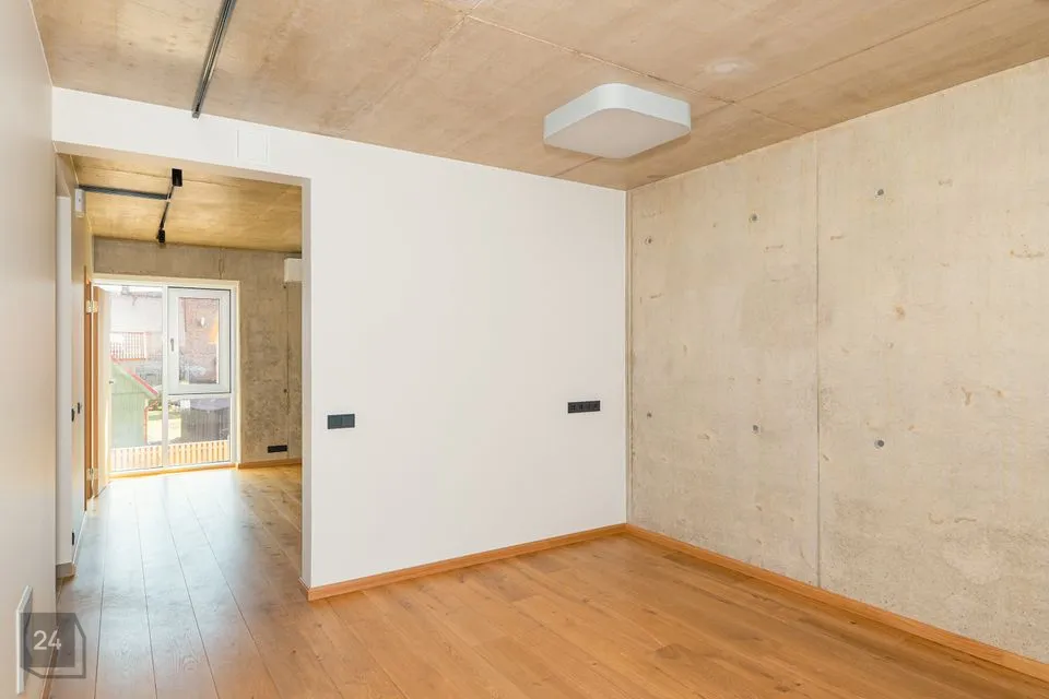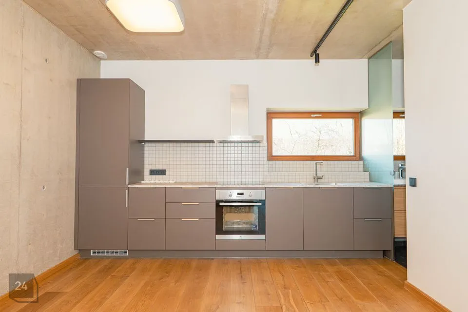 Põrandaid katab tamme parket, elutoa seinad ja lagi isikupära loov betoon.