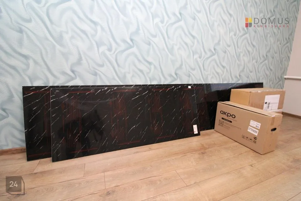 Kõõgimööbel vajab paika sättimist - olemas on nii uus mööbel, kui ka köögi tagaseina osad, kraanikauss, kubu ja keraamiline pliit.