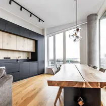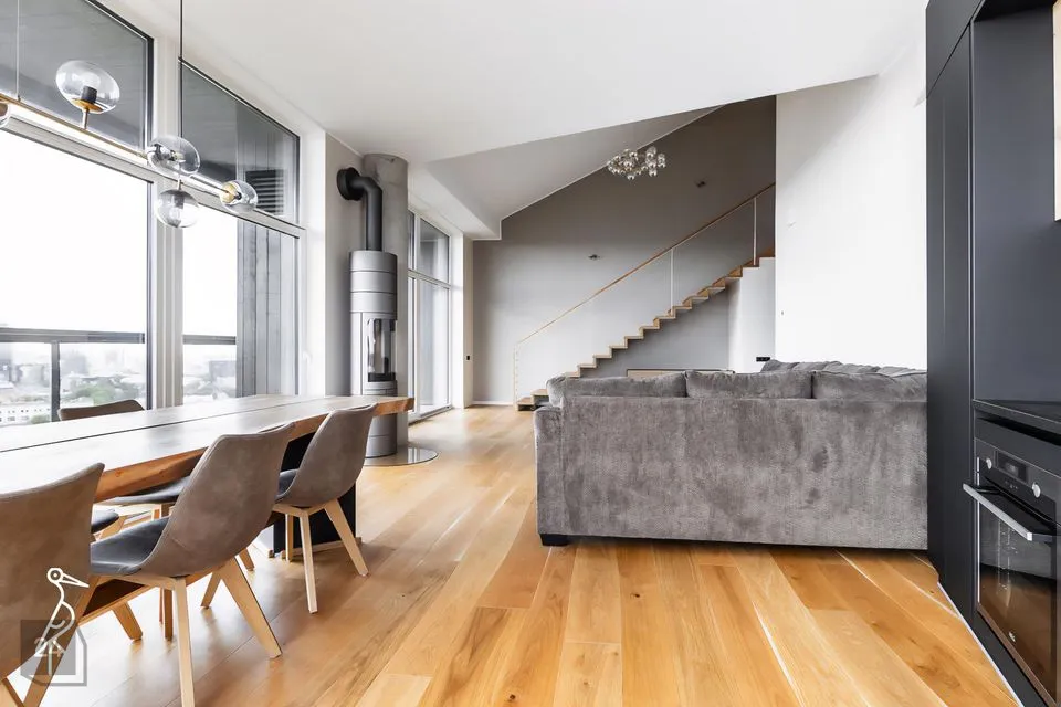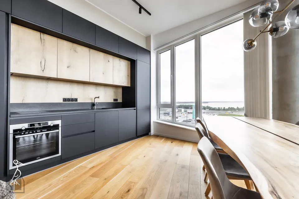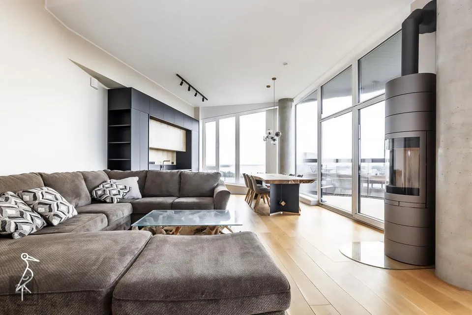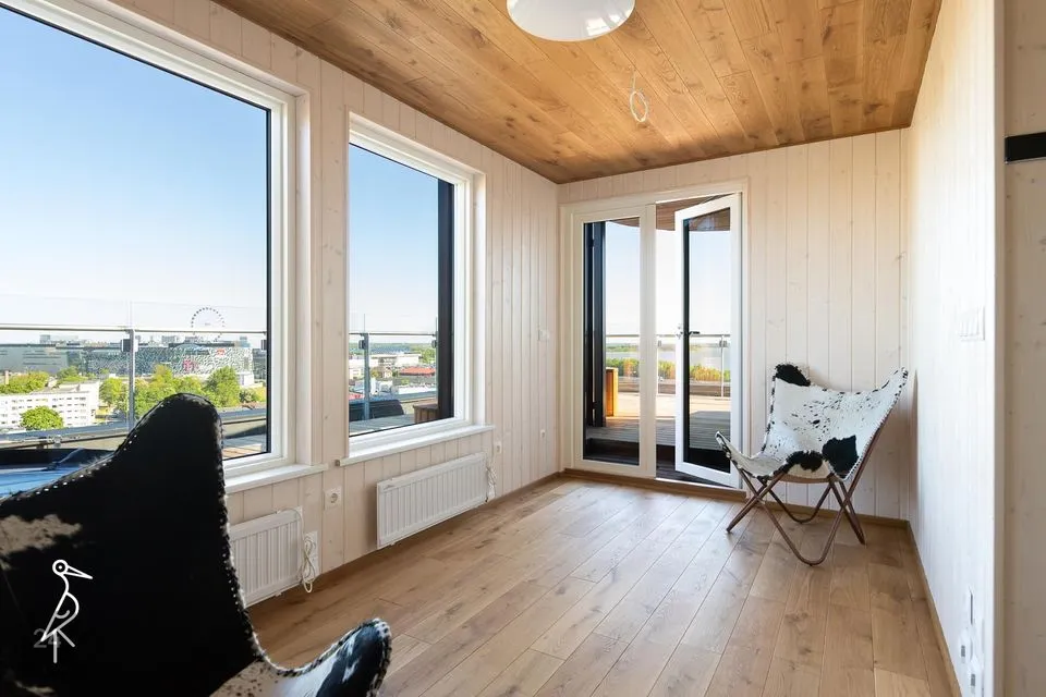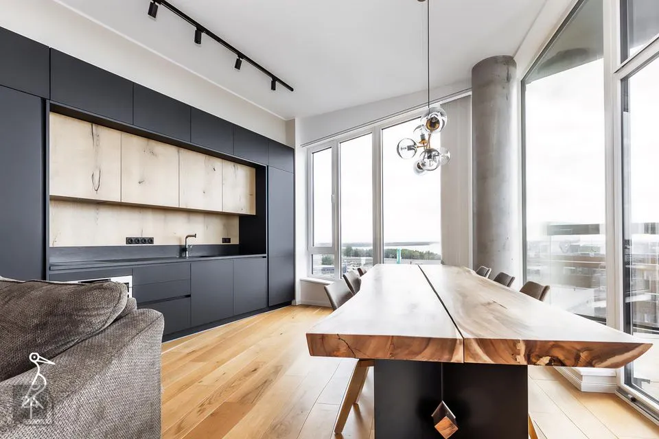 128,7 m² suuruse üldpinnaga 13. korrusel asuv korter on kaasaegsete lahendustega, avatud planeeringuga ning valgusküllane. Skyline Residence’i siseviimistluslahendused on loonud nimekas Šveitsi ettevõte Spacewise. Interjöör võtab detailideni arvesse tornide erilist asukohta ja positsiooni, ühendades kvaliteedi, linnalikkuse ja loomulikkuse.