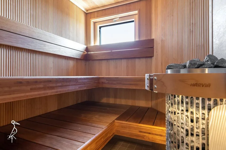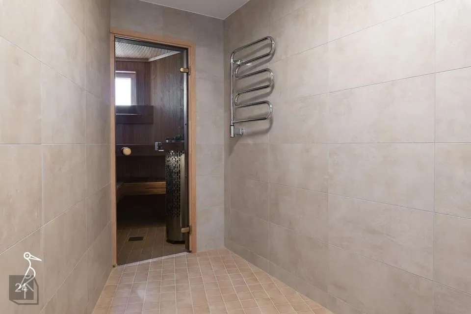 Katuseterrassil on kümblustünn, mida on võimalik aastaringselt nautida. Erilahendusena valminud saunas on Harvia keris, mille ümar disan pehmendab ja elavdab klassikalise sauna nurgelist interjööri, lisades leiliruumile elegantsust.