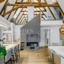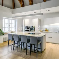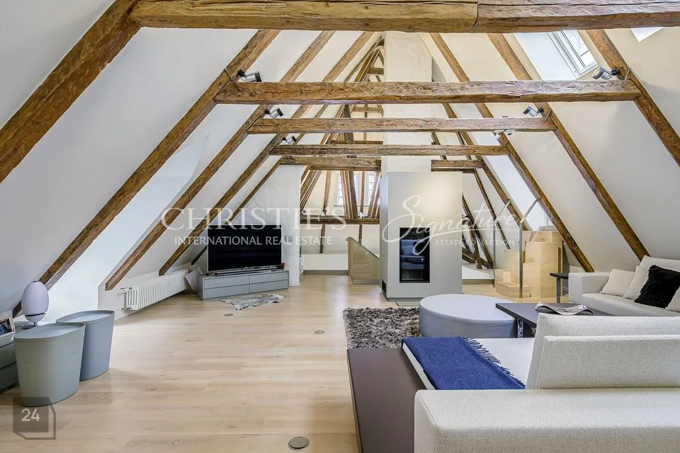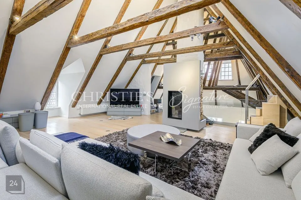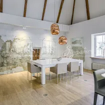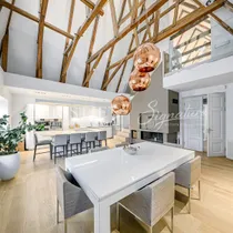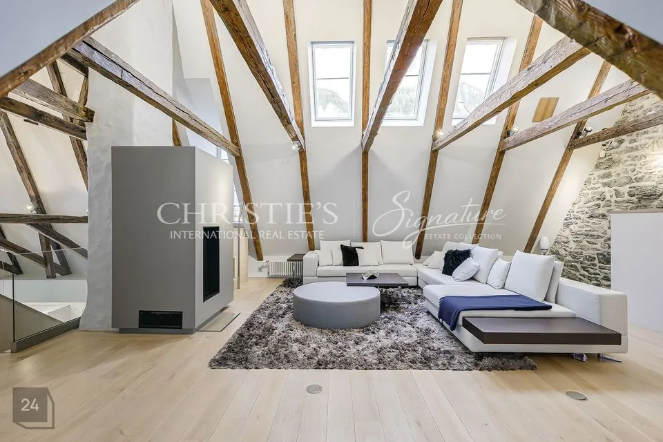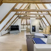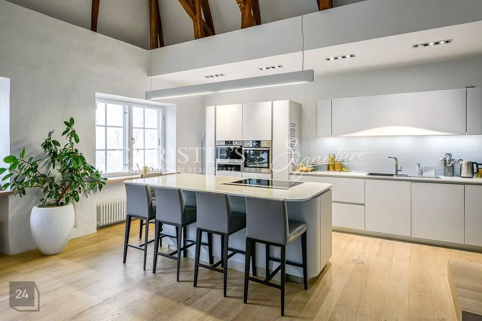A massive selection of old and thick wooden beans decorate the ceiling in the living room and kitchen where the room height reaches close to 8 meters.