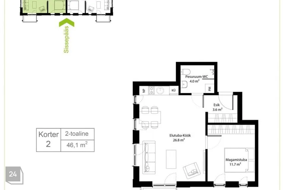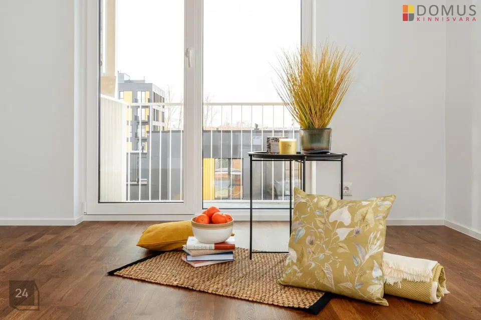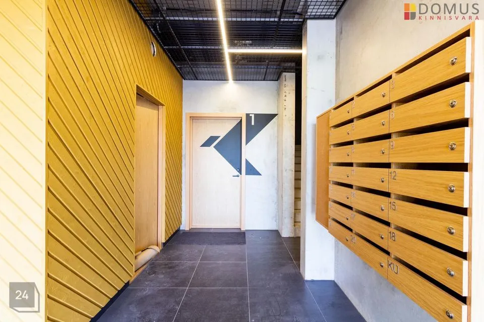 See 2-toaline korter asub liftiga tornmaja teisel korrusel. Korteris on üks magamistuba, avatud köögiga elutuba, esik ja WC-duširuum. Korteri aknad avanevad elamu ette ja küljele, elutoast pääs rõdule (2,8 m2).