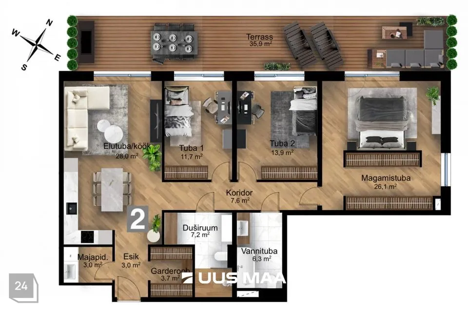 Korter koosneb avarast ja valgusrikkast elutoast avatud köögiga, ühest suurest magamistoast ja kahest väiksemast magamistoast, eraldi mahukast walk-in garderoobist, vannitoast (WC ja vann) ning täiendavast duširuumist ja majapidamisruumist. Kõikidest eluruumidest on otse ligipääs avarale ja päikselisele terrassile. Korteri aknad jäävad lääne poole.