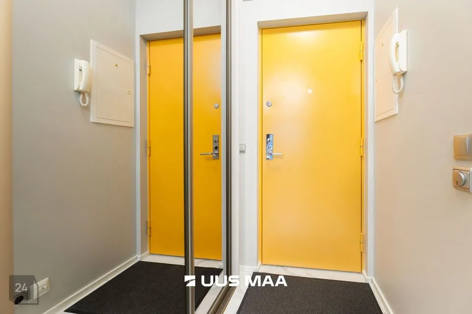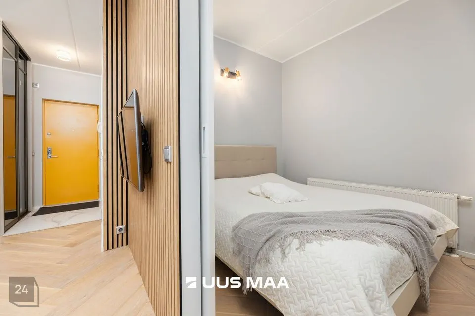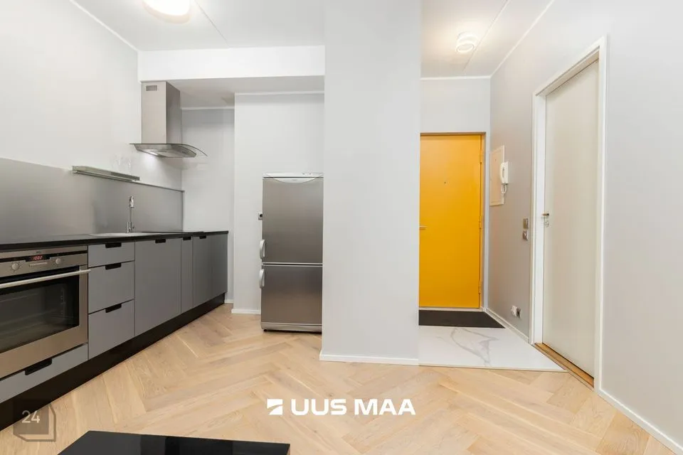 Uksest sisse astudes on koridoris mahukas sisseehitatud riidekapp, kuhu saab mugavalt kõik riided ära mahutada. Avatud köök-elutoas on diivan, diivanilaud ning köögist leiab nii suure ahju, keraamilise pliidi kui ka külmkapi. Põrandad on kaetud kvaliteetse naturaalse valge tamme kalasaba parketiga. Elutoast pääseb suurele rõdule (7,2m2), kus on mõnus peale tööpäeva lõõgastuda. Magamistuba eraldab elutoast suure lükanduksega sein. Korter on kõrgete lagedega (üle 2,7m) ja valgusküllane.