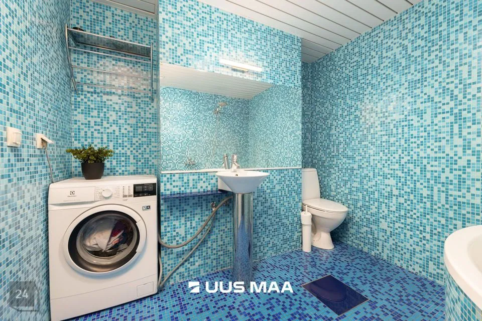 Suures põrandasoojendusega vannitoas on koht pesumasinale, kraanikauss, wc ja massazivann.