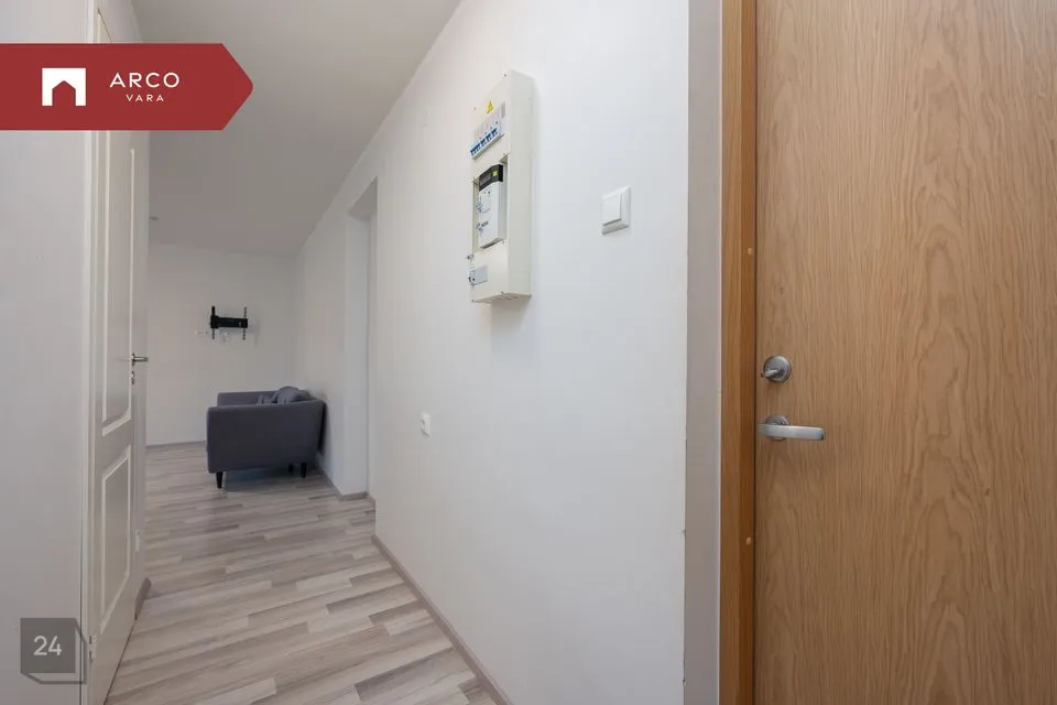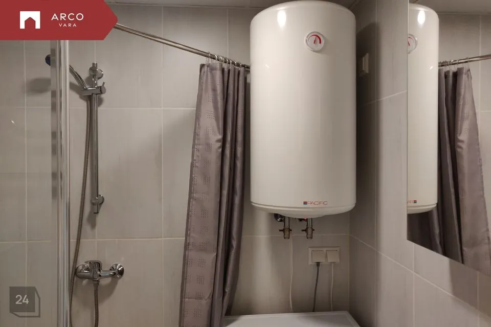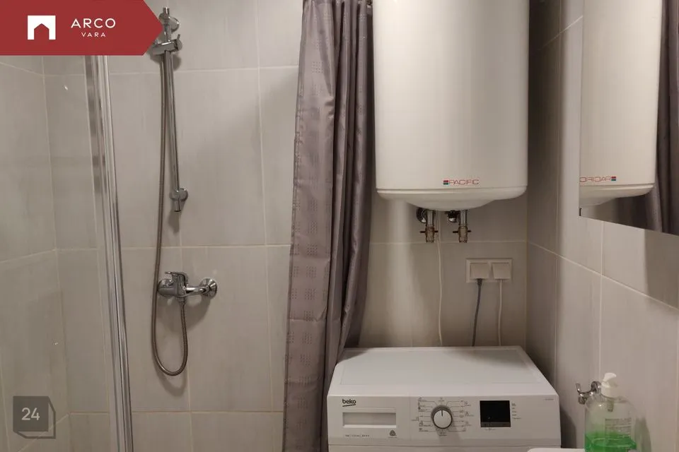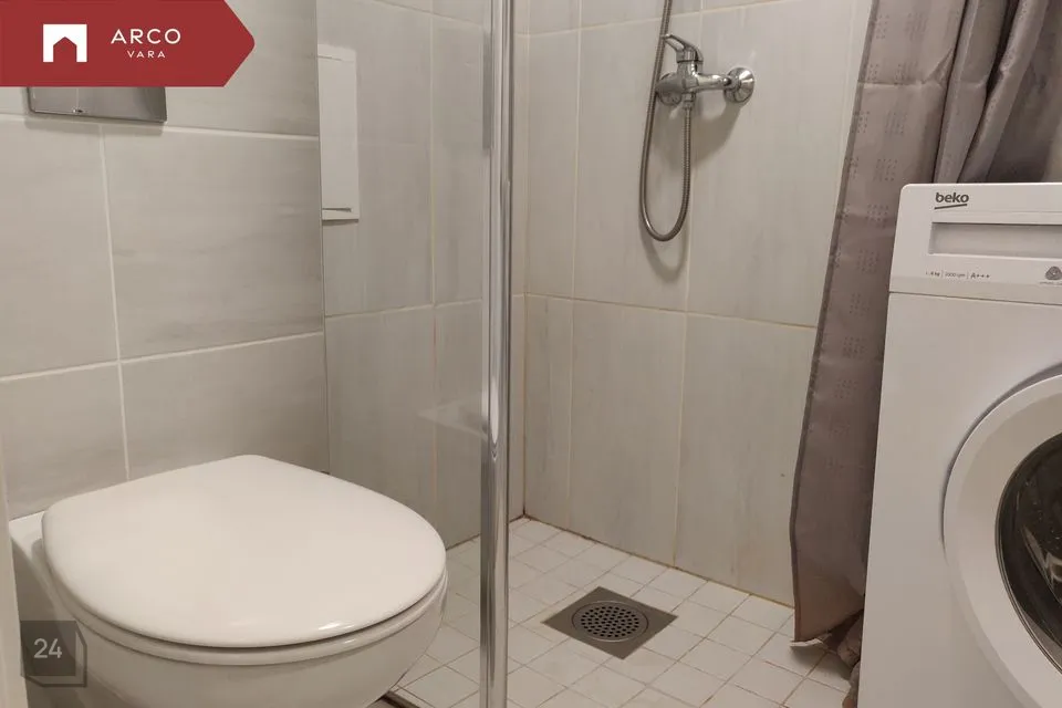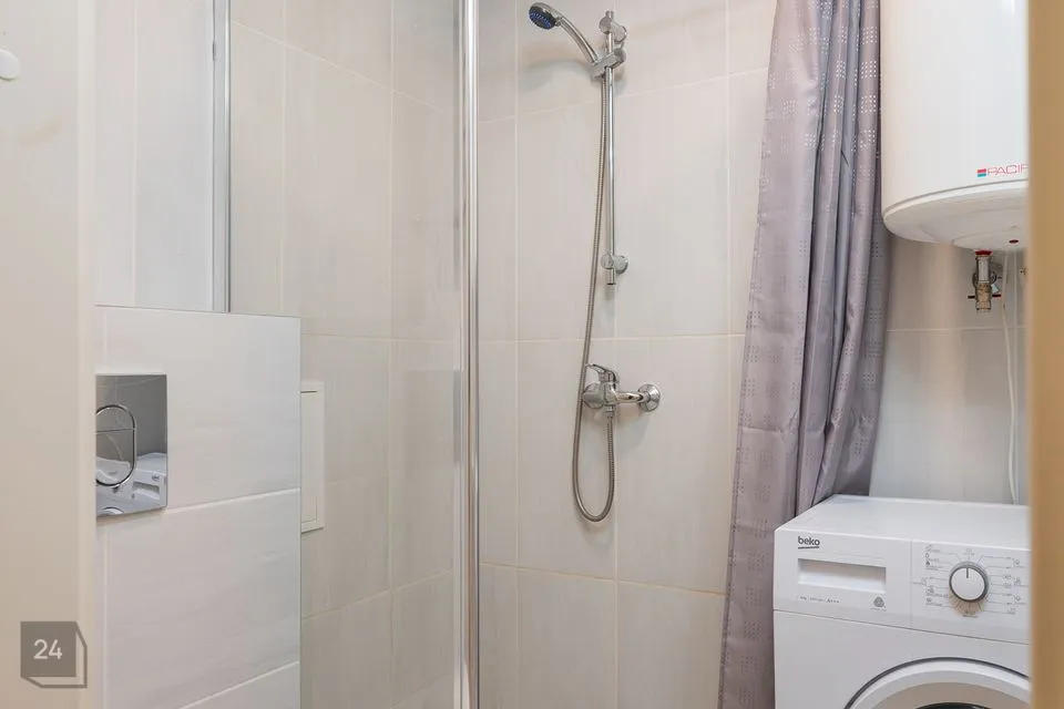 The kitchen-living room features kitchen furniture (integrated Berk stove, Cata extractor hood, and Berk refrigerator), toaster and kettle, dining table and 2 chairs, sofa and TV wall mount. Roller blinds in the kitchen-living room, curtains in the bedrooms. One bedroom has a spacious wardrobe. Laminate flooring in the hallway and rooms, walls painted. The WC-shower room is combined and has underfloor heating, with a Beko washing machine. Hot water provided by a boiler.