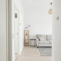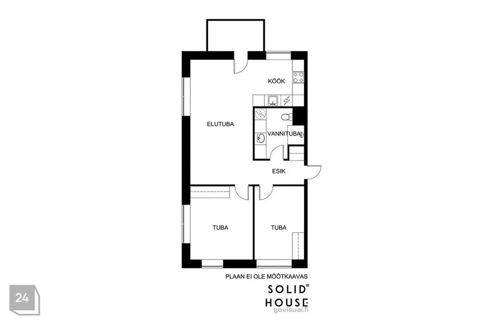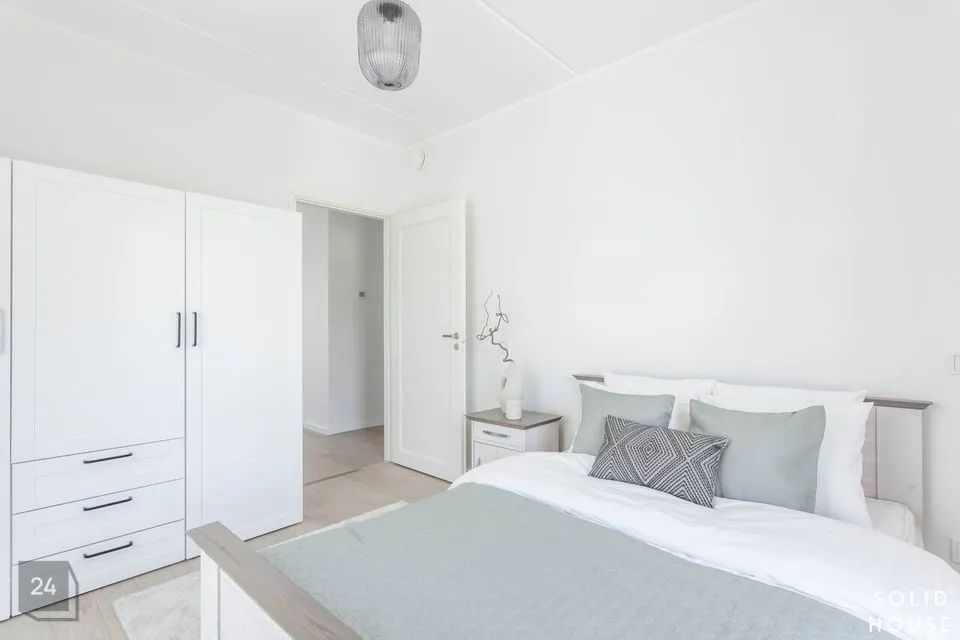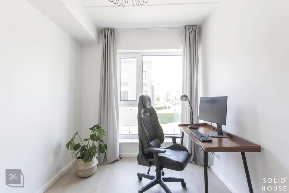 Esikust vasakule jäävad kaks magamistuba, mille suurused on vastavalt 9,2 m² ja 11,3 m². Korteri paremal poolel paikneb avatud köök koos avara elutoaga, mis on varustatud kvaliteetse integreeritud tehnikaga. Suurele rõdule pääseb mugavalt elutoast. WC ja duširuum on kokku ehitatud, pakkudes mugavust ja funktsionaalsust. Korteri juurde kuulub parkimiskoht maja ees, ning maja lõunaküljel eraldi sissepääsuga asuvad panipaigad, mis on spetsiaalselt mõeldud rataste, jalutuskärude ja muude esemete hoiustamiseks.