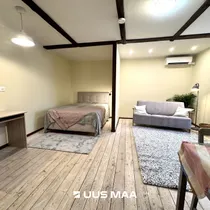 Korteris on piltidel nähtav mööbel ja tehnika: Voodi, kahekohaline diivan, laud ja toolid, riiulid, köögimööbel, külmutuskapp, induktsioonpliit, vannitoas ka pealtlaetav pesumasin, vaibad ja valgustid.