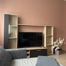 Открытая гостиная/кухня - большой диван-кровать, тумба под телевизор, телевизор, холодильник, плита, обеденный стол и стулья;